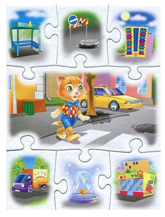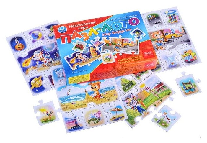 Игра Пазл-лото включает в себя четыре сюжетные картинки, объединенных одной теметикой. Каждое игровое поле содержит центральную картинку и 6 элементов, которые по смыслу принадлежат ей. Ребенок в процессе игры методом подбора находит нужные элементы и соединяет их с центральным полем.