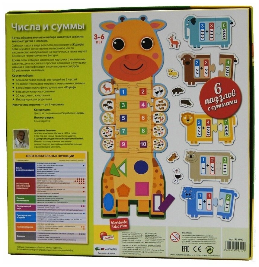 | Комплектация | большой пазл-жираф, 10 элементов пазла-жираф, 6 геометрических фигур, 6 пазлов-животных саванны, 20 карточек с животными, инструкция для родителей, |