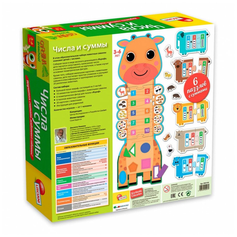 В этом образовательном наборе животные саванны знакомят детей с числами. Собирая пазл в виде веселого Жирафа, дети научатся: сопоставлять написанное число и