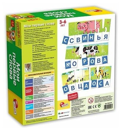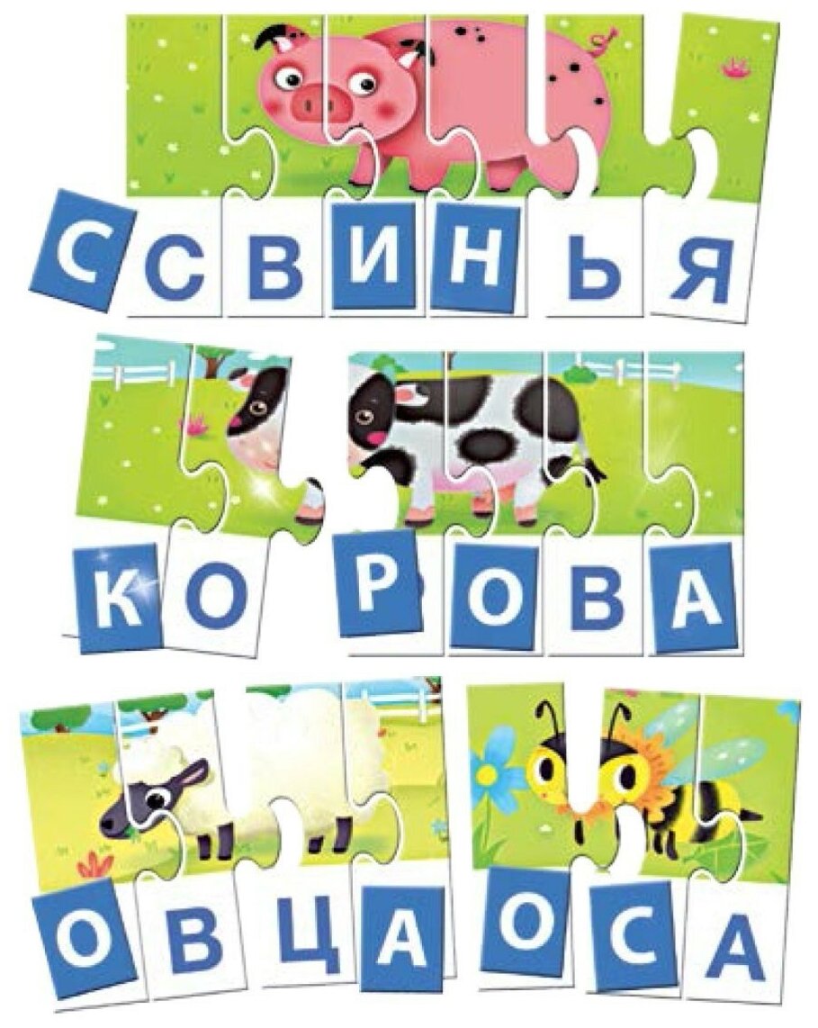 Игра направлена на обучение ребенка чтению и составлению слов с трехлетнего возраста. Пазлы помогут ребенку понять, как можно составлять изображения и слова. Пользуясь набором букв и собранными пазлами, ребенок сможет сам выкладывать слова и буквы.
