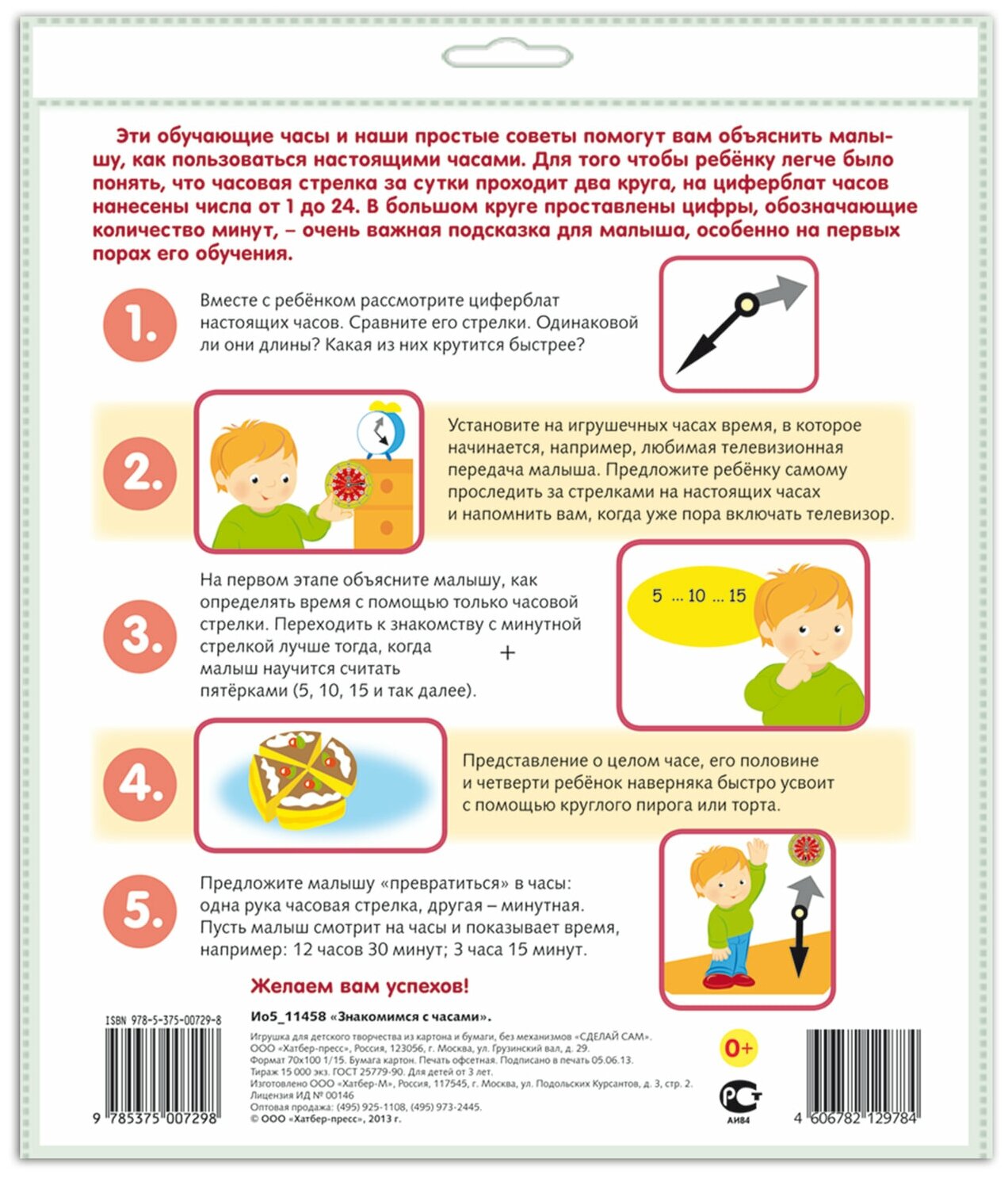 На обратной стороне изделия даны пошаговые советы для ознакомления малыша с такими понятиями как “часы” и “время”. Игра обязательно понравится малышу, и он с удовольствием будет с ней проводить много времени с большим интересом.