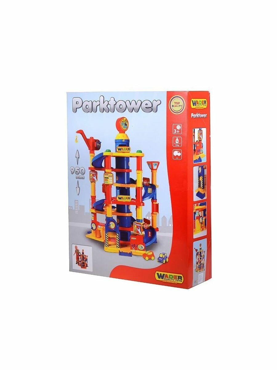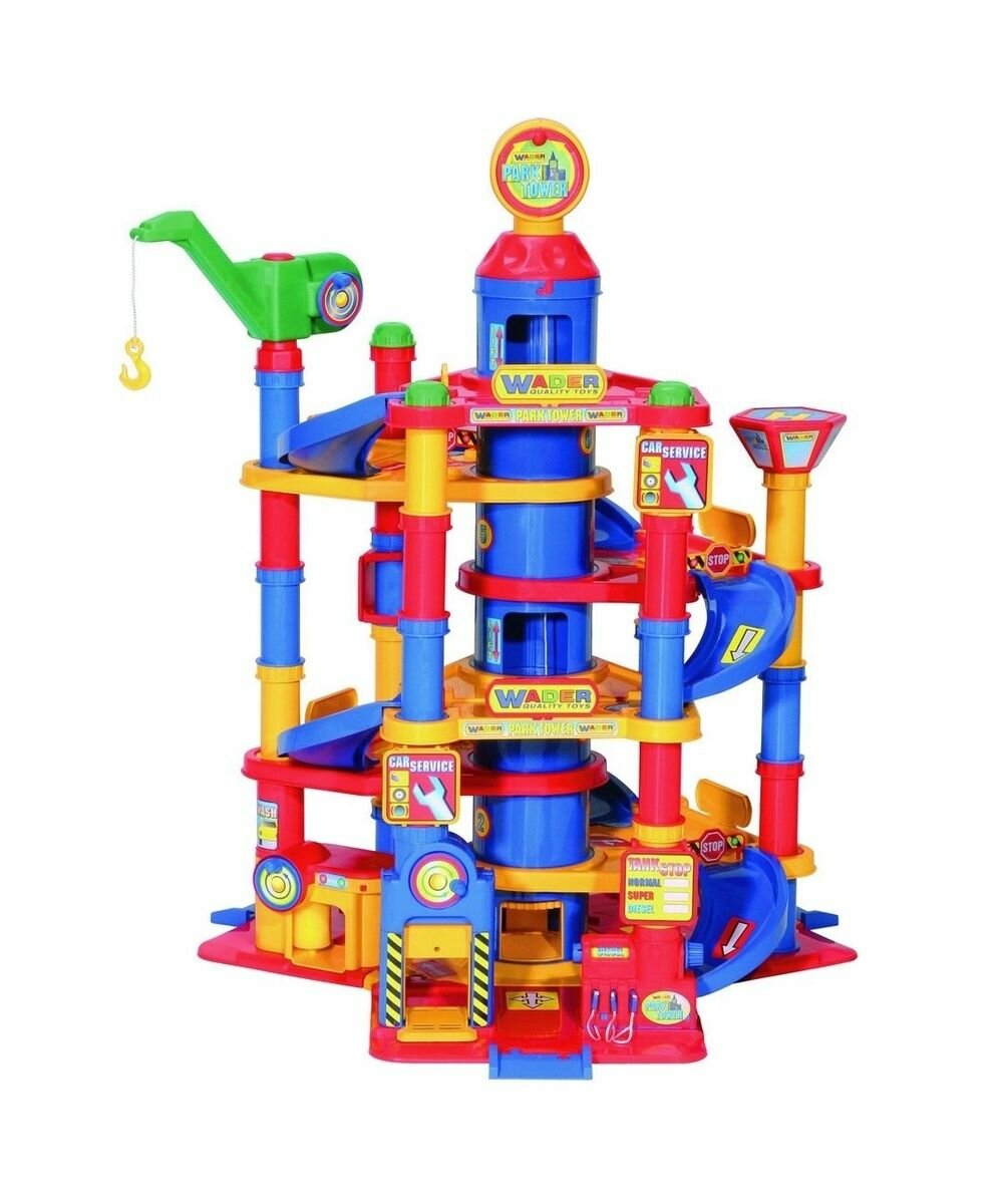 Wader , может стать прекрасным подарком для любого ребенка. Особенности: Развивает у детей логику, моторику и интерес к моделированию различных ситуаций, а также станет местом где дети и родители играют вместе. В сочетании с дорожными знаками, заправкой, грузовиками, самолетиками, трапом для самолета можно создать полноценный городок который станет любимым местом игры для вашего ребенка! Для подъема или спуска на этаж установлен башенный кран на верху парковки, а также можно использовать лифт или серпантинную дорогу. В нижней части Паркинга установлены: автомойка, автосервис, смотровая яма, бензоколонка. В комплект входит: башенный кран, серпантинные лестницы, здание паркинга, знаки, заправка, мойка, автомастерская, лифт и 3 машинки, дорожные коммуникации и пр.