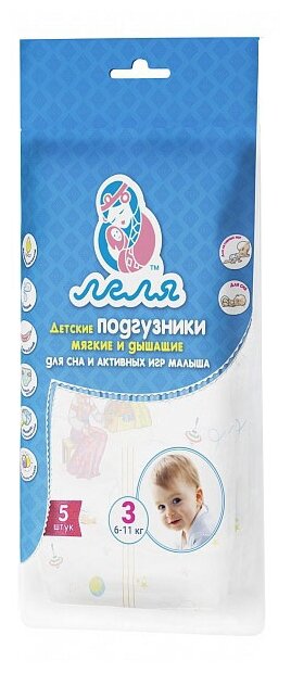 Подгузники Леля детские № 3 (6-11 кг) 20 штук. Подгузники «Леля» - это новая линейка отечественных подгузников премиум-класса, разработанные с учетом анатомических особенностей новорождённых. Отличительной особенностью продукции является то, что они не стесняют движений малыша, в подгузниках ребёнок может активно двигаться как ему угодно.