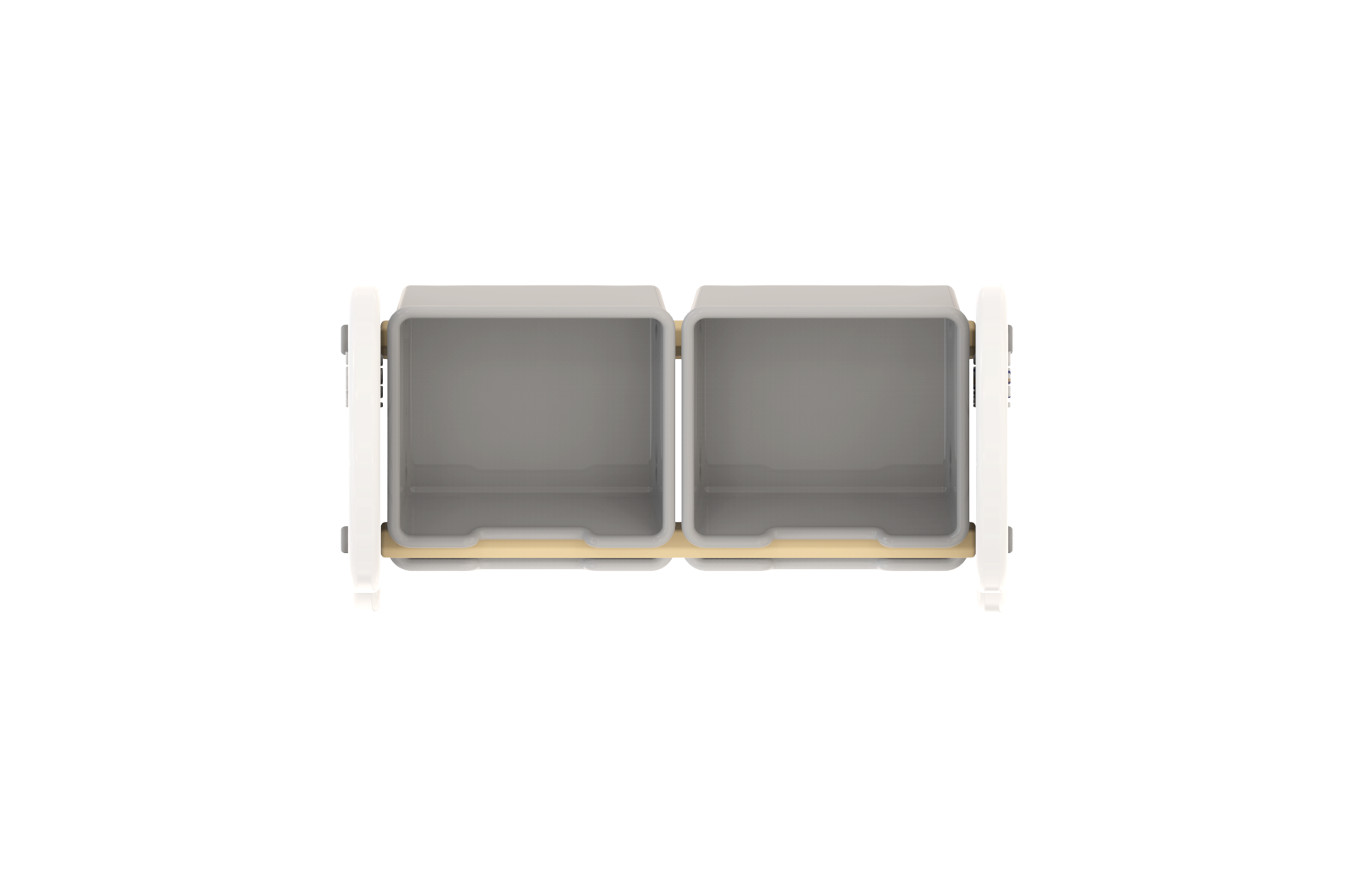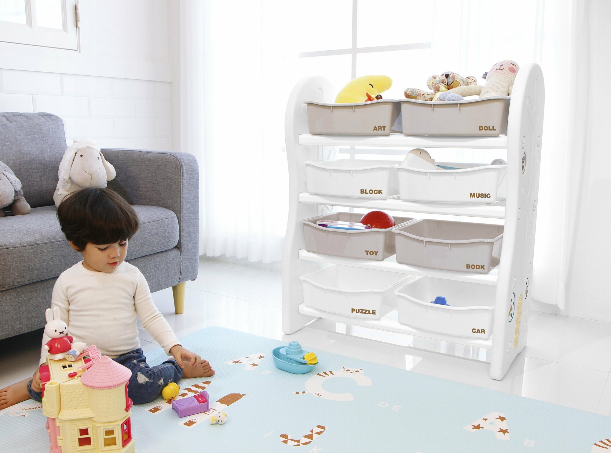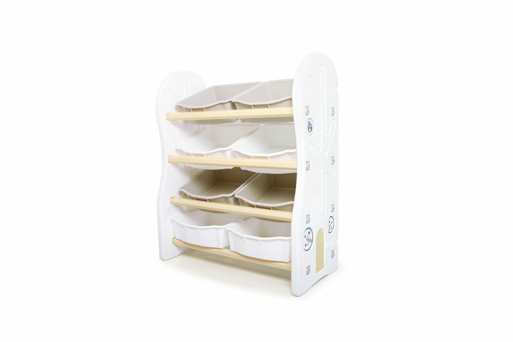 Вместительный стеллаж для игрушек DesignToy-1 выполнен в привлекательной светлой цветовой гамме. Материалом для него служит корейский безопасный пластик PP/PE, который легко моется простыми чистящими средствами.