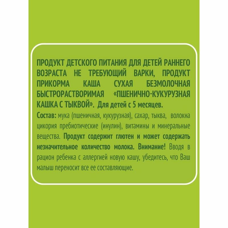 | Способ приготовления | Для 5-месячного ребёнка возьмите 25 г (3,5 столовые ложки) сухого продукта на 180 мл воды. Рекомендуемое количество порций каши 1-2 в день. |