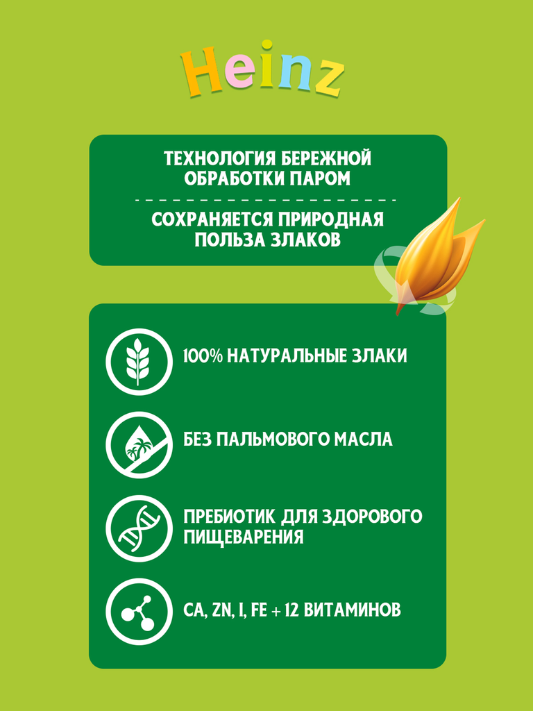 Детская каша Хайнц (Heinz) является незаменимым продуктом для полноценного и гармоничного развития ребенка. В состав кашек Heinz входит олигофруктоза и инулин, который относится к истинным природным пребиотикам растительного происхождения и в значительном количестве содержится в артишоке, спарже, топинамбуре, цикории, пшенице, бананах, луке-порее, чесноке. Инулин также способствует всасыванию кальция и благоприятно влияет на обмен липидов. Безмолочные детские каши занимают особое место среди первых видов прикорма и относятся к первым быстрорастворимым продуктам прикорма для детей на зерновой основе. Часто педиатры рекомендуют начинать злаковый прикорм именно с них.