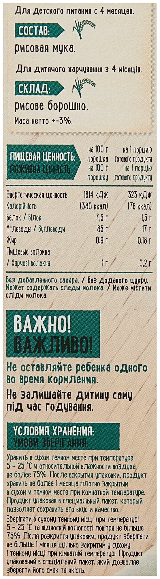 Состав: 100% рис, без глютена, без молока, без сахара, никаких лишних ингредиентов, только его натуральная природная польза. Специально для самых маленьких.