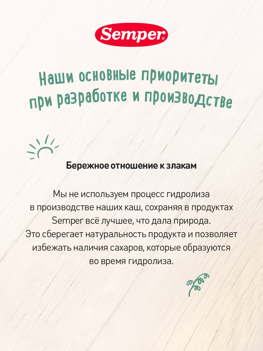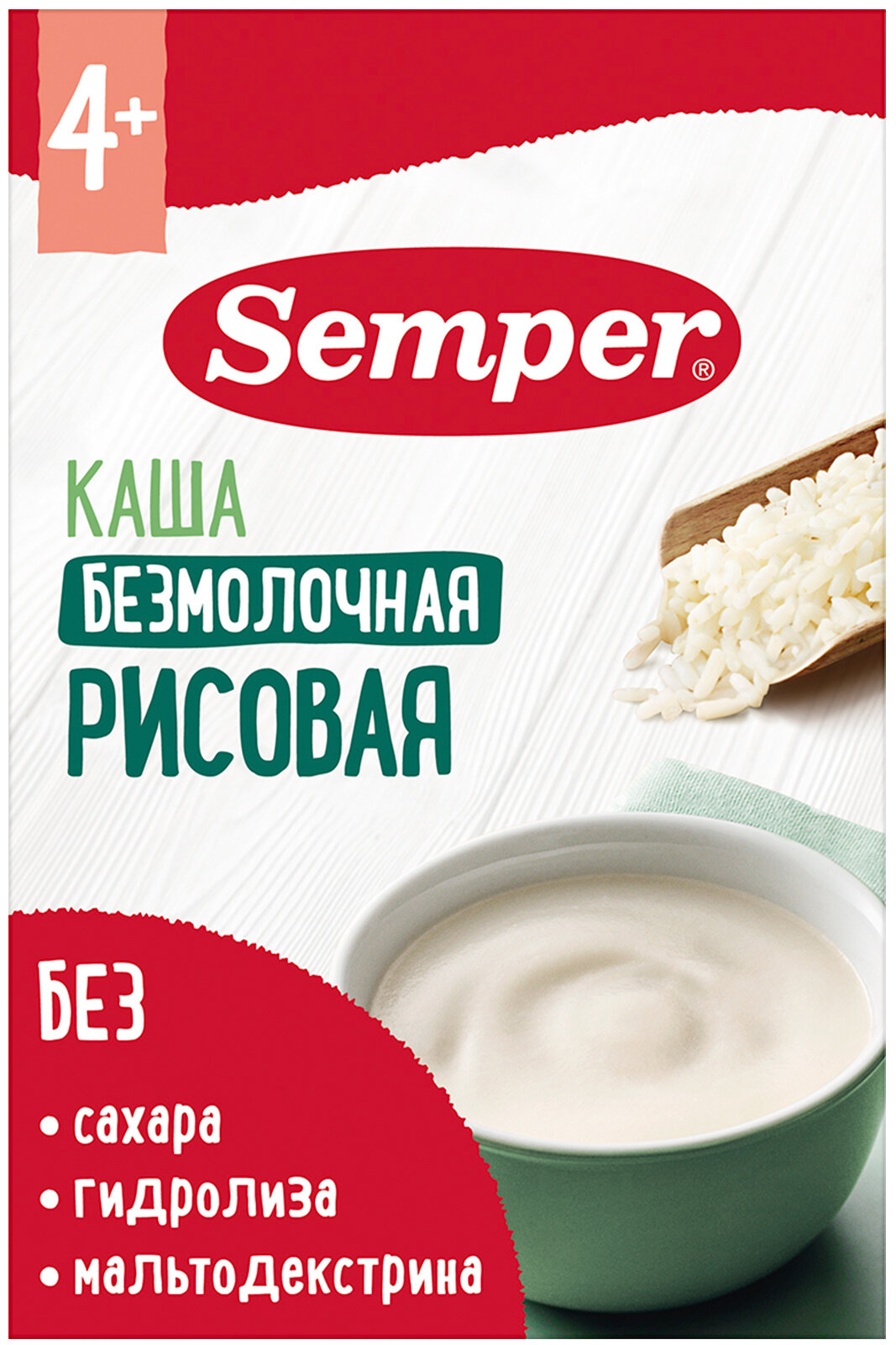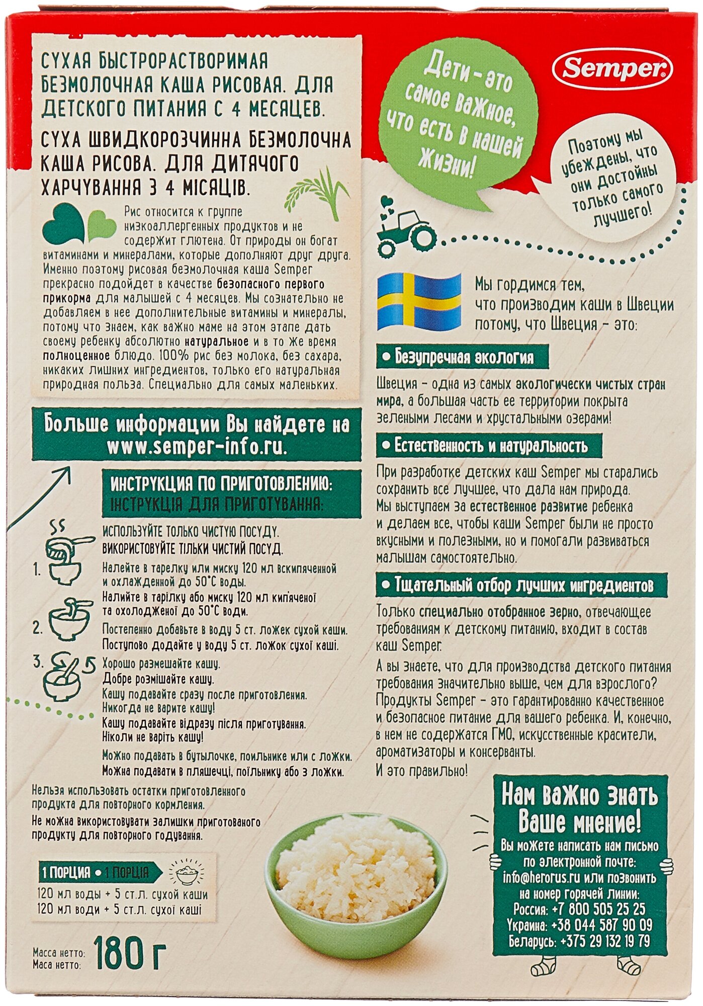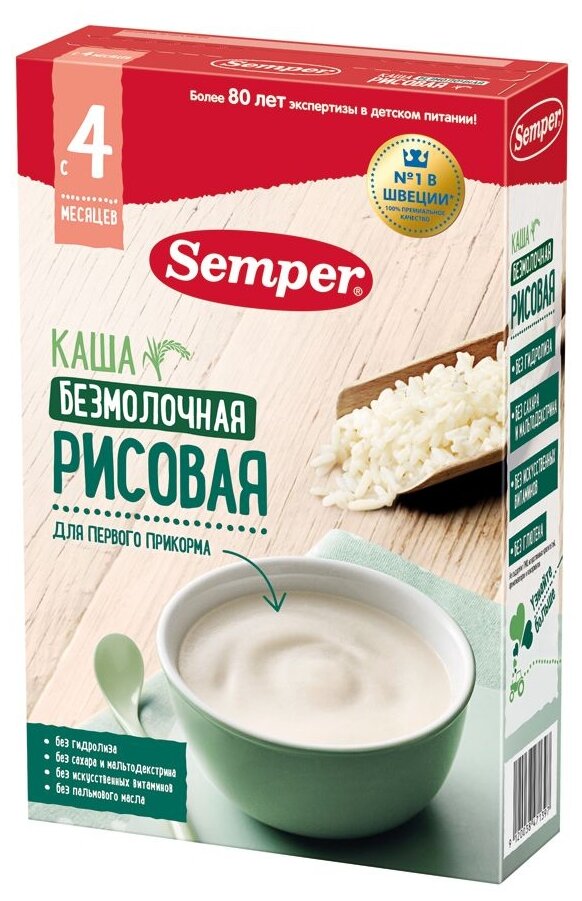 Рис - гипоаллергенный злак, поэтому рисовая безмолочная каша Semper прекрасно подойдет в качестве безопасного первого прикорма для малышей с 4 месяцев.