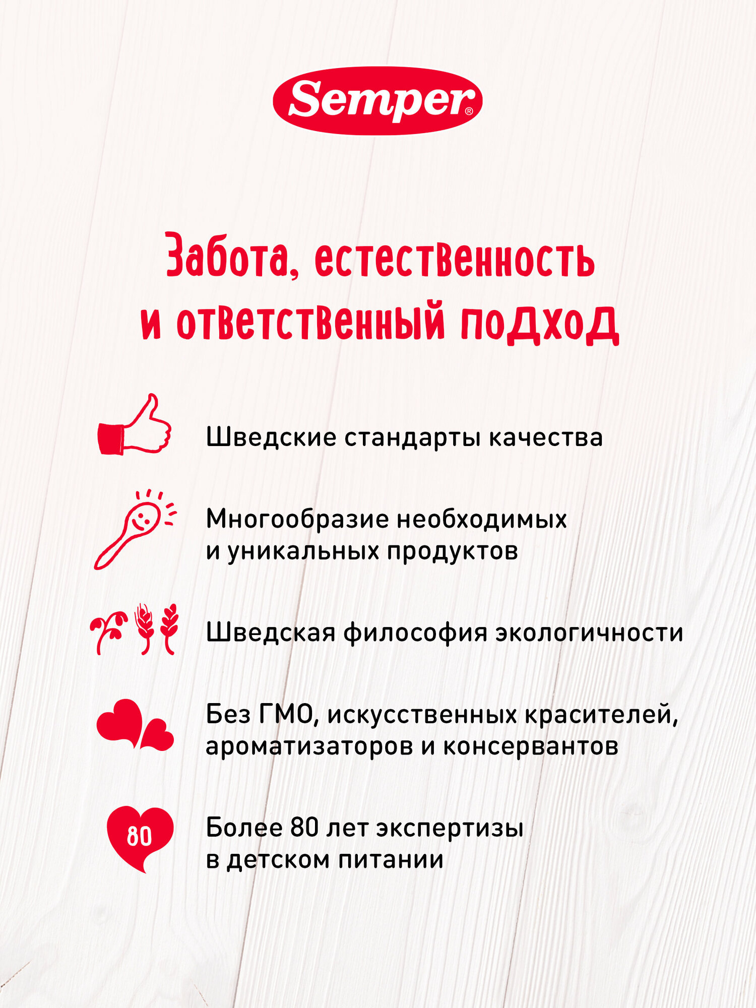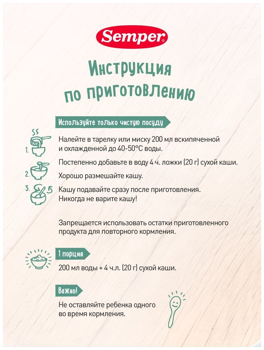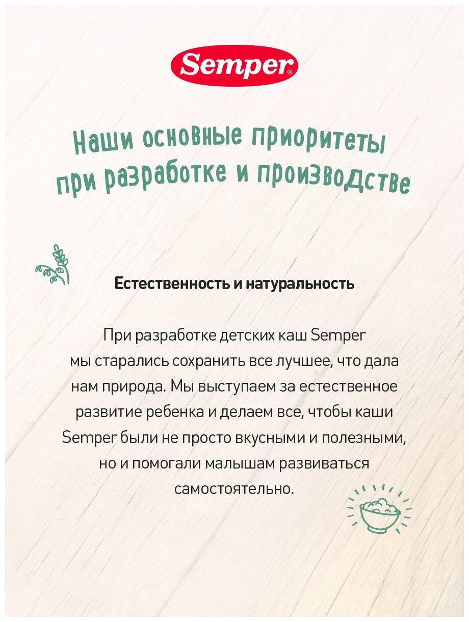 Рис - гипоаллергенный злак, поэтому рисовая безмолочная каша Semper прекрасно подойдет в качестве безопасного первого прикорма для малышей с 4 месяцев.