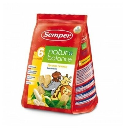 Ароматное печенье Semper naturbalance со вкусом банана обогащено железом, кальцием и витамином С. Печенье сделано в форме забавных фигурок — животных из зоопарка, чтобы десерт для малыша был не только полезным и вкусным, но и интересным.