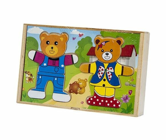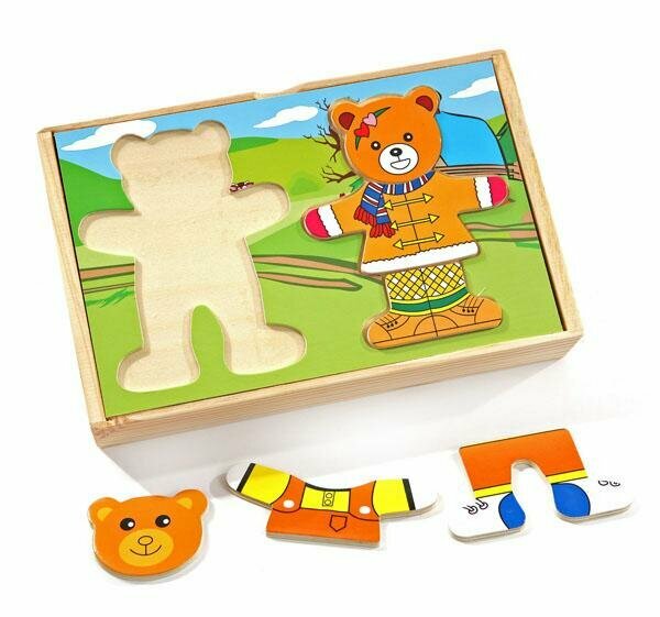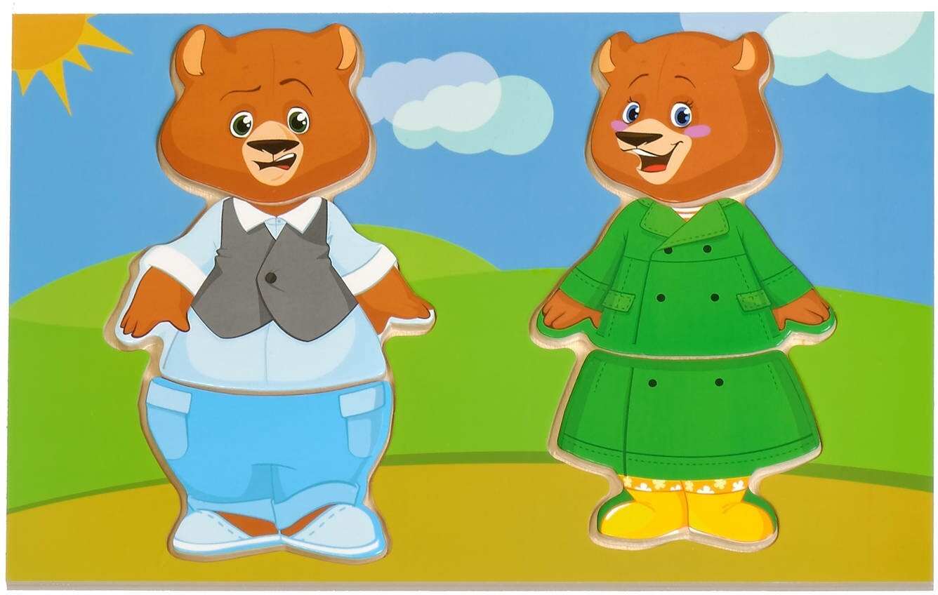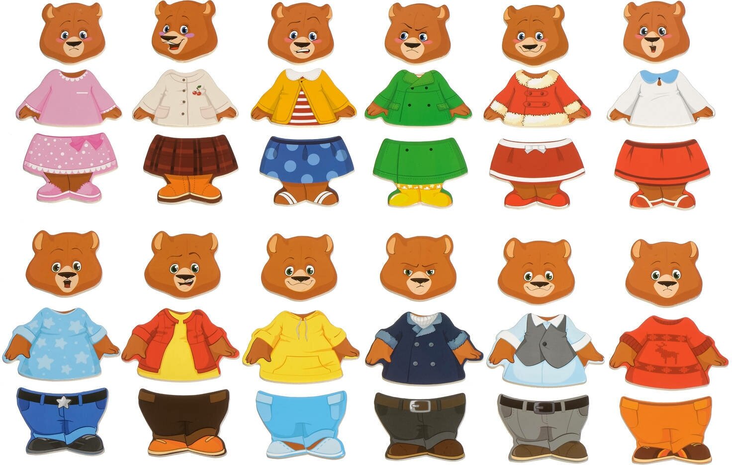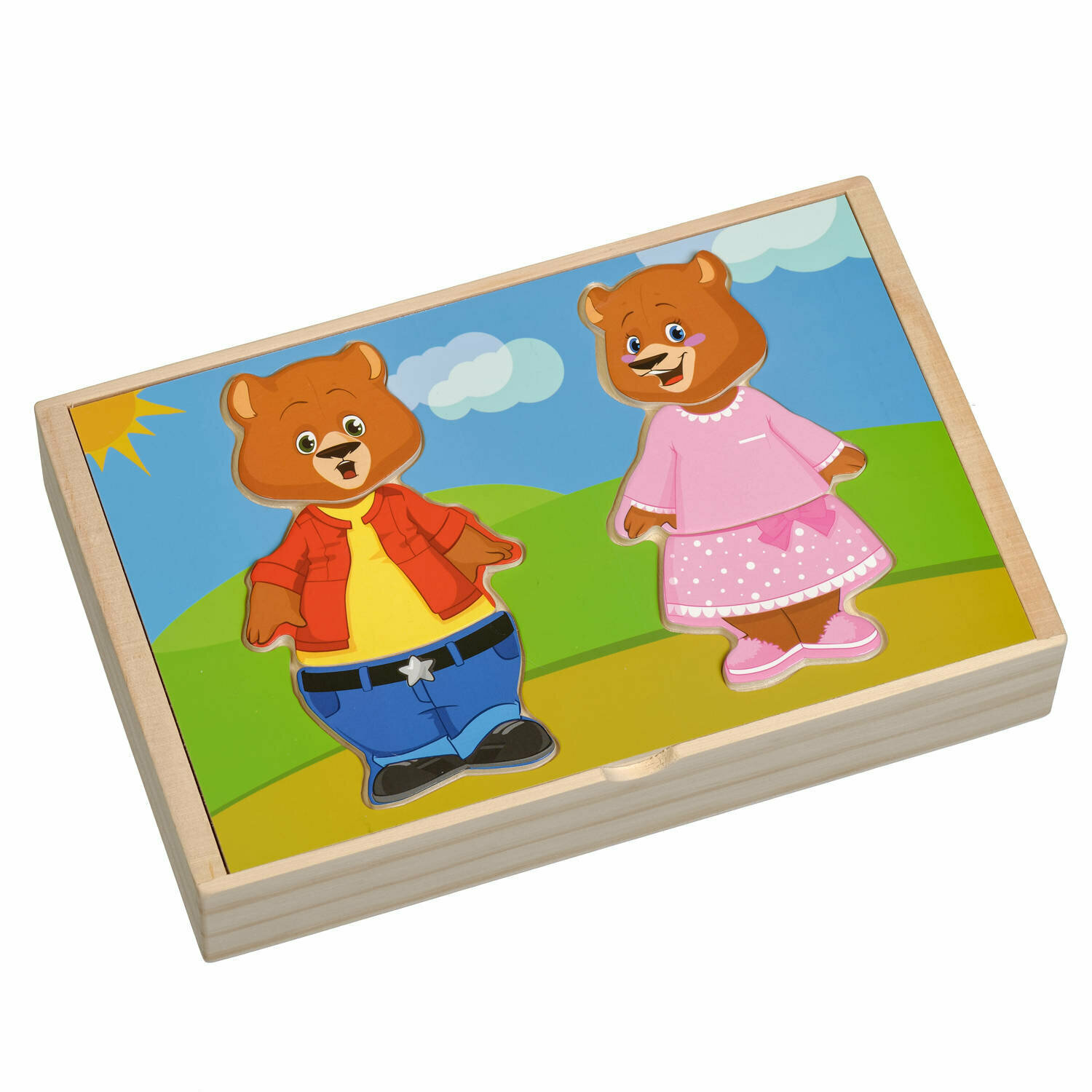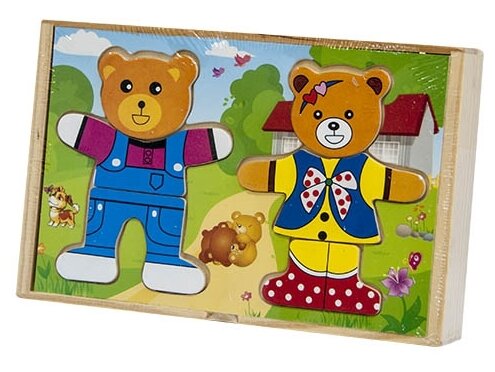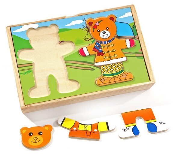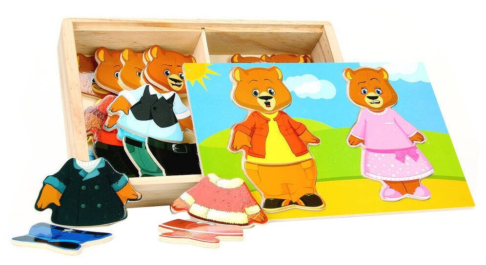 На крышке ящичка расположилась рамка для семьи медведей. Задача ребенка - подобрать каждому персонажу игры свой наряд, сочетая детали одежды по цвету и стилю и учитывая размер. Из маленьких кусочков составляется красочная картина.