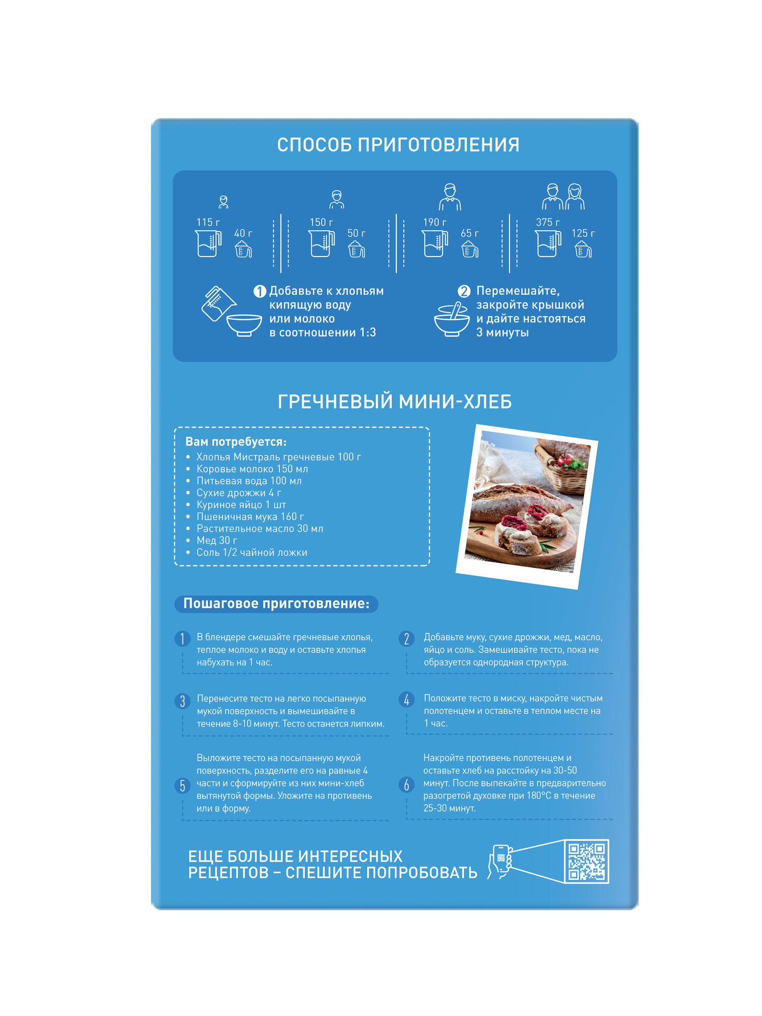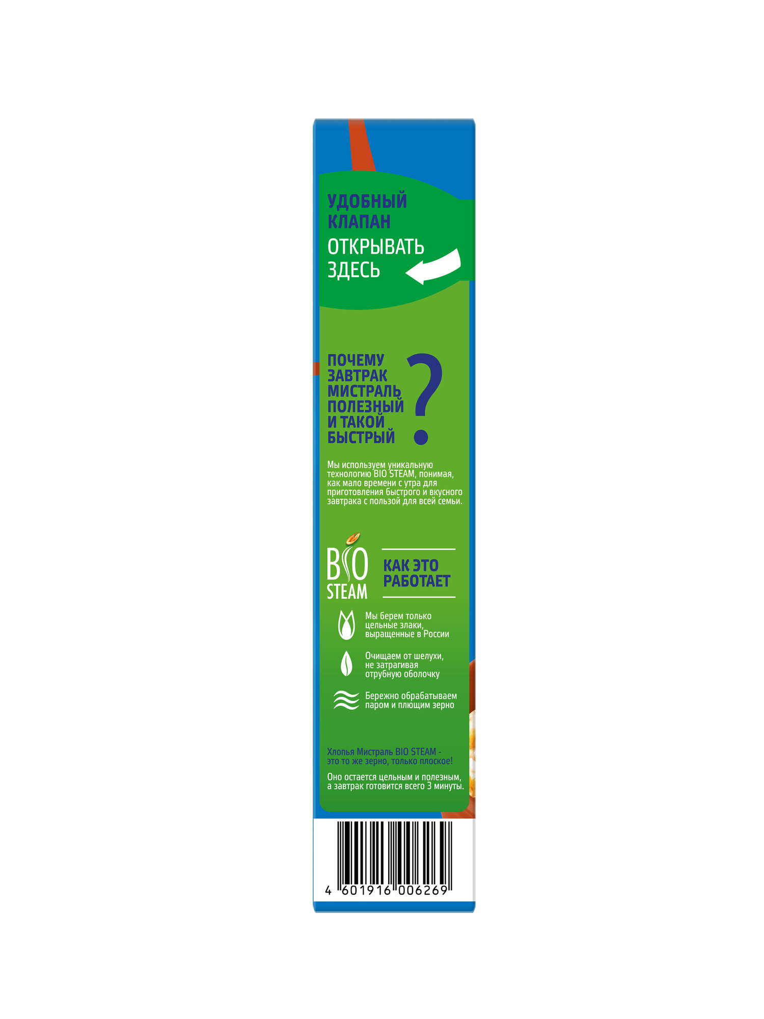 Секрет натуральности хлопьев Мистраль прост: хлопья — это то же зерно, только плоское. Производитель закупает злаки в оптимальных для них климатических зонах России, очищает от шелухи, не затрагивая отрубевую оболочку, пропаривает под давлением и расплющивает. Зерно остается цельным и сохраняет свои природные свойства. Теперь можно приготовить полезный горячий завтрак, потратив лишь несколько минут.