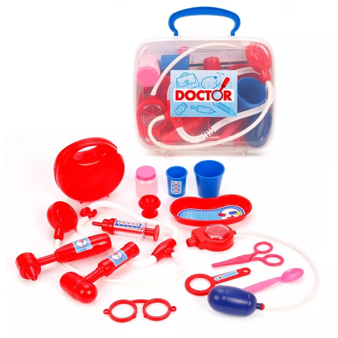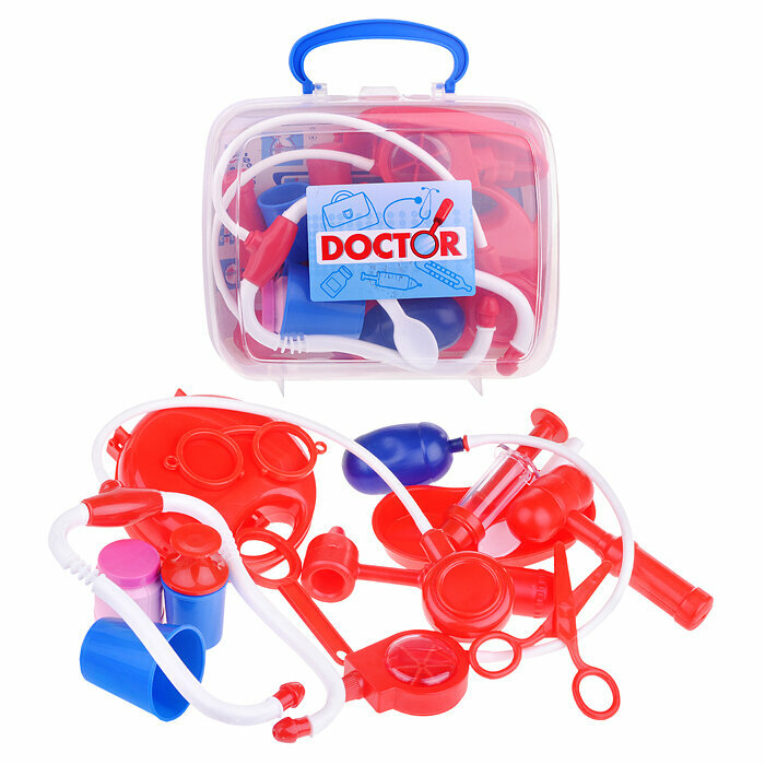 | Состав набора | фонендоскоп, очки, тонометр, медицинский лоток, ножницы, молоточек, шприц, баночки для лекарств, ложечка и другие медицинские приборы |