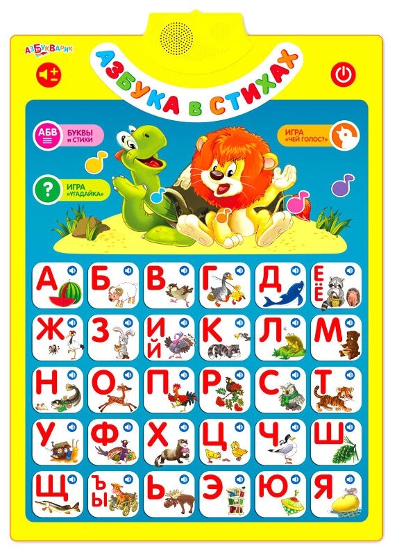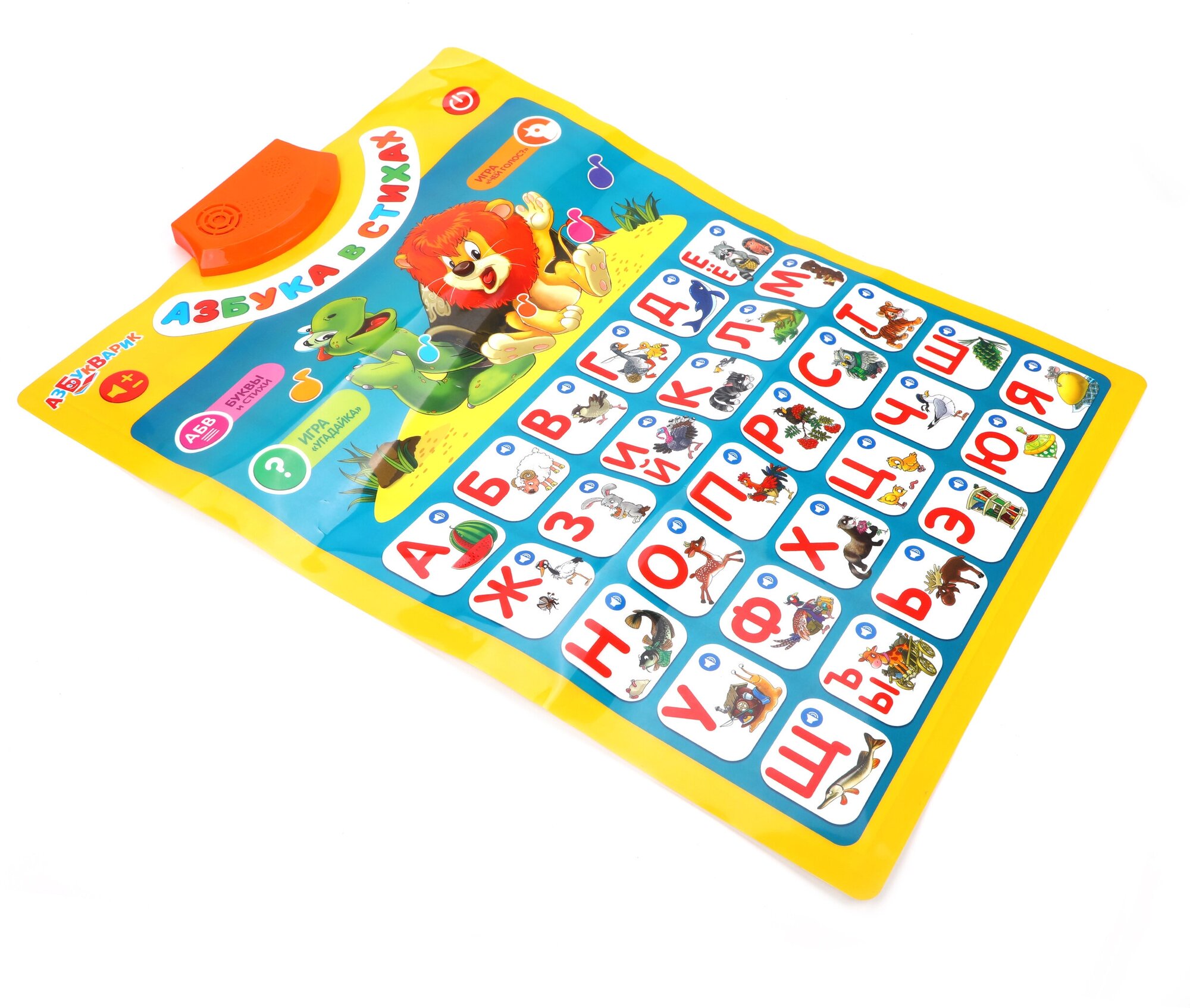 Хотите, чтобы ваш ребенок легко выучил буквы? Интерактивный говорящий плакат «Азбука в стихах» – отличный выбор! Большие буквы, яркие картинки, стихи Владимира Степанова, песенки мультяшек («Облака», «Песенка про кузнечика», «Чунга-чанга», «Песня Львёнка и Черепахи»), умные игры («Угадайка» и «Чей голос») – всё это сделает обучение весёлым и интересным! Плакат можно повесить на стену или играть с ним на столе.