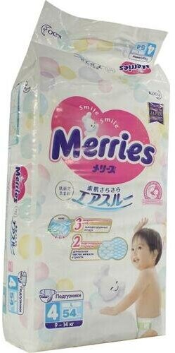 - Подгузники Merries, размер L, 9-14 кг, 54 шт
