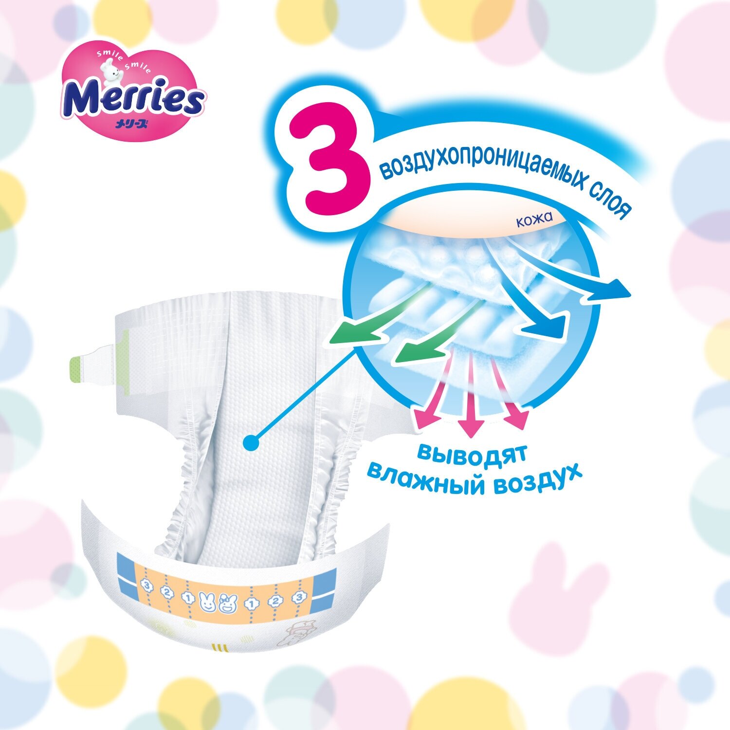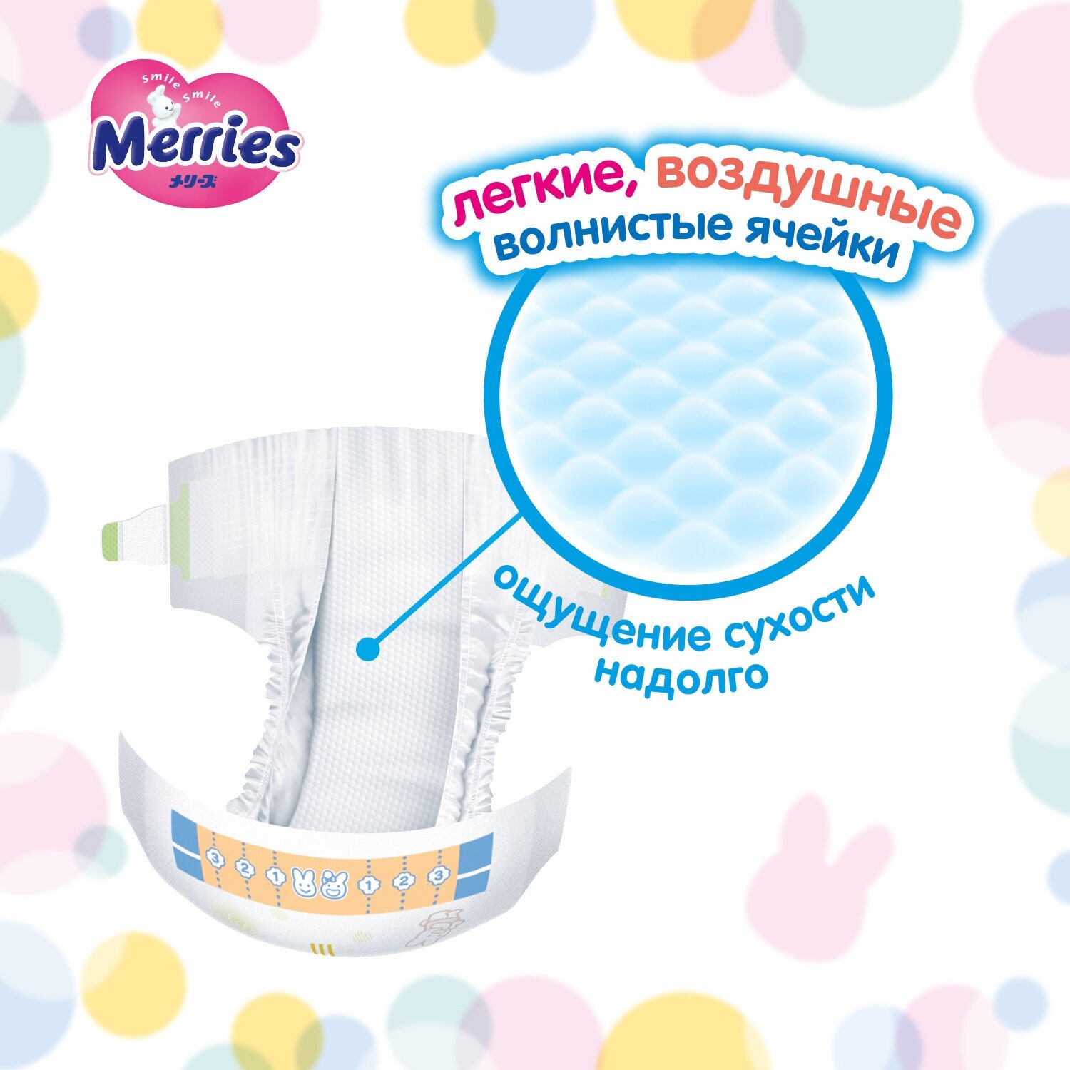 Нежные воздушные подушечки. В 3 раза больше воздуха! (в сравнении со средним показателем объема воздуха в волнистом слое подгузников Merries предыдущего поколения) Размещение нового материала с увеличенными ячейками в центральной зоне подгузника для наибольшего впитывания. Материал, который контактирует с кожей, стал ещё нежнее. Подгузник остается мягким и нежным к коже даже после того, как впитает много жидкости. А мелкие ячейки, расположенные по бокам волнистого слоя, надежно удерживают жидкий стул, предотвращая его растекание. Merries заботится о коже вашего ребенка!