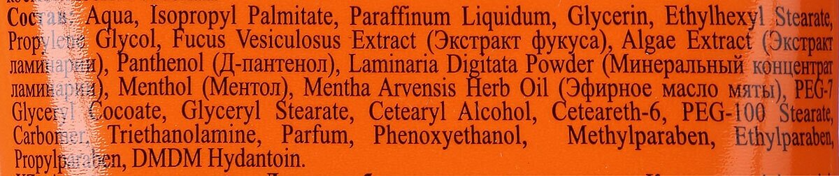 Состав: Aqua, Glycine Soja Oil (масло соевое), Cocos Nucifera Oil (масло кокосовое), Glycerin, Ananas Sativus Fruit Extract (Экстракт ананаса), Cetearyl Alcohol, Glyceryl Stearate, Betaine, Capsicum Annuum Extract (Экстракт перца), Cetyl Palmitate, PEG-40 Hydrogenated Castor Oil, Brassica Nigra Seed Powder (Молотые зерна горчицы), Xanthan Gum, Niacin (Кислота никотиновая), Beta-Carotene, Citrus Aurantium Dulcis Peel Oil Expressed (Эфирное масло сладкого апельсина), Citrus Aurantium Bergamia Fruit Oil (Эфирное масло бергамота), Caffeine (Кофеин), Parfum, Benzoic Acid, Sorbic Acid, Dehydroacetic Acid, Benzyl alcohol.