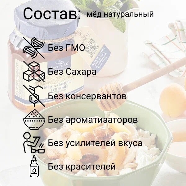 Ботанический состав: горное разнотравье, гречиха (могут присутствовать: ива, медуница, акация желтая, синюха, дягиль сибирский, дудник лесной, осот, малина и кипрей и другие ценные медоносы)