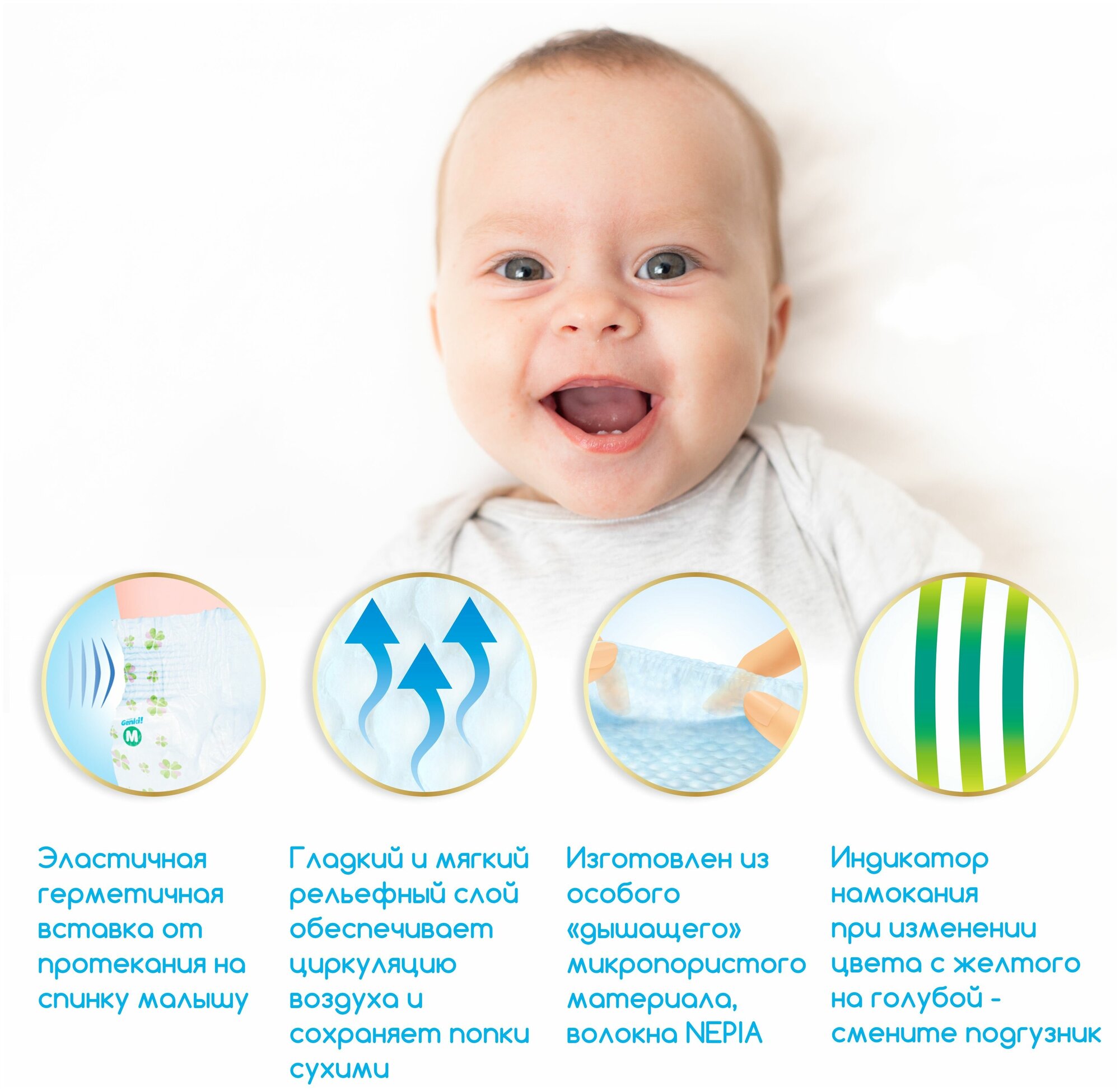 - Дышащая поверхность внешней и внутренней стороны подгузника пропускает к коже ребёнка воздух, сохраняя ее сухой.