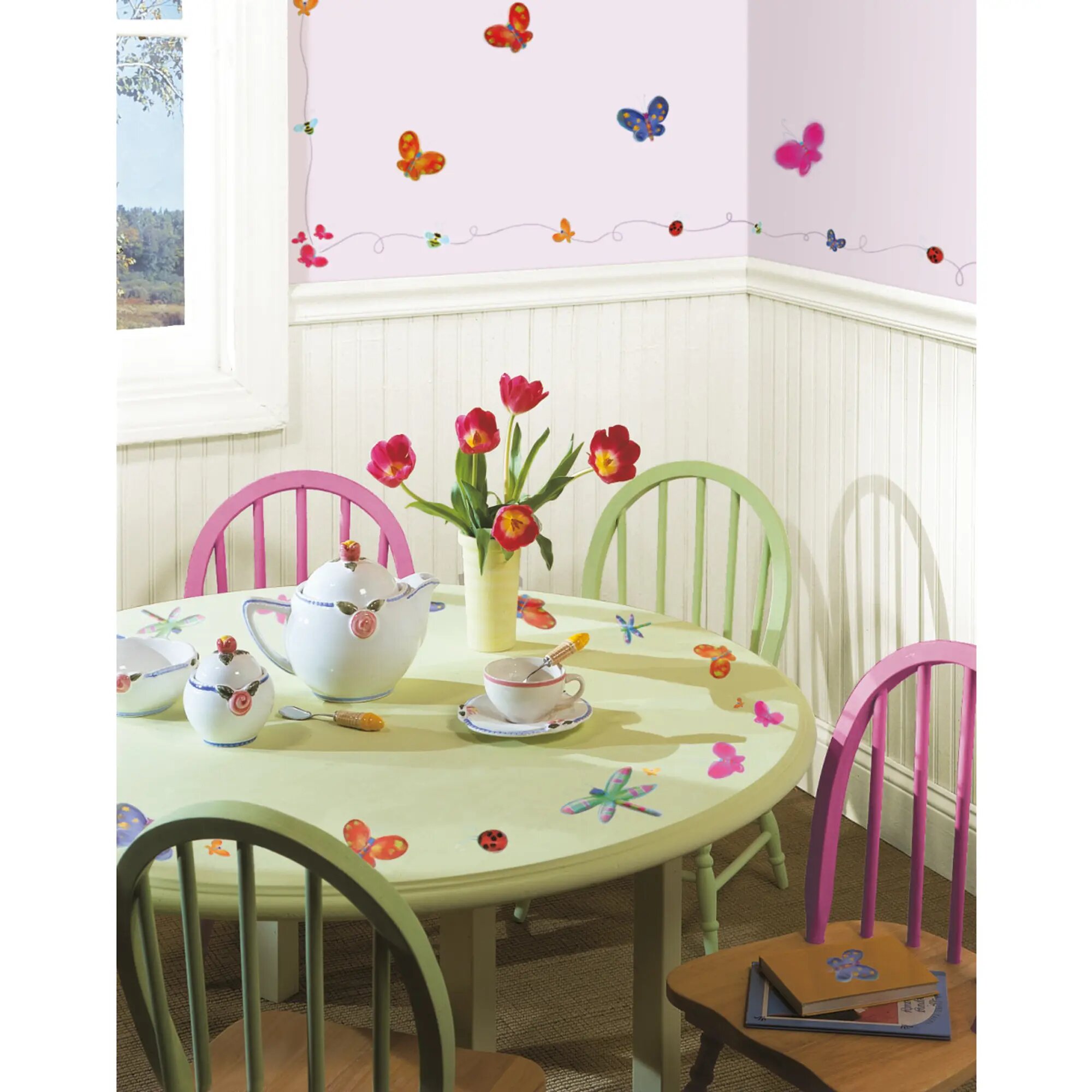 Наклейки для декора Насекомые от знаменитого производителя RoomMates станут украшением вашей квартиры! Наклейки, входящие в набор, содержат яркие изображения бабочек, стрекоз и божьих коровок разного цвета и размера. Набор прекрасно подходит для спальни, ванной или игровой комнаты. Всего в наборе 51 стикеров. Наклейки не нужно вырезать - их следует просто отсоединить от защитного слоя и поместить на стену или любую другую плоскую гладкую поверхность. Наклейки многоразовые: их легко переклеивать и снимать со