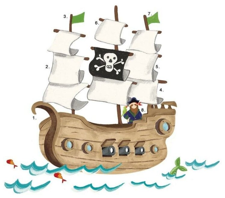 Наклейки для декора Пиратский корабль от знаменитого производителя RoomMates станут украшением вашей квартиры! Придайте яркий и оригинальный вид комнате вашего ребенка с новым набором наклеек большого формата для декора! Наклейки, входящие в набор, содержат изображение плывущего по волнам пиратского корабля, с капитаном корабля, стоящим на борту, и его попугаем. Размер изображения в собранном виде (как представлено на фотографии) составляет 92,7 х 109,8 см. Всего в наборе 18 стикеров. Наклейки не нужно вырезать - их следует просто отсоединить от защитного слоя и поместить на стену или любую другую плоскую гладкую поверхность. Наклейки многоразовые: их легко переклеивать и снимать со стены, они не оставляют липких следов на поверхности. Набор напечатан на прозрачном материале. Рекомендован для использования на стенах белого и светлого цвета.