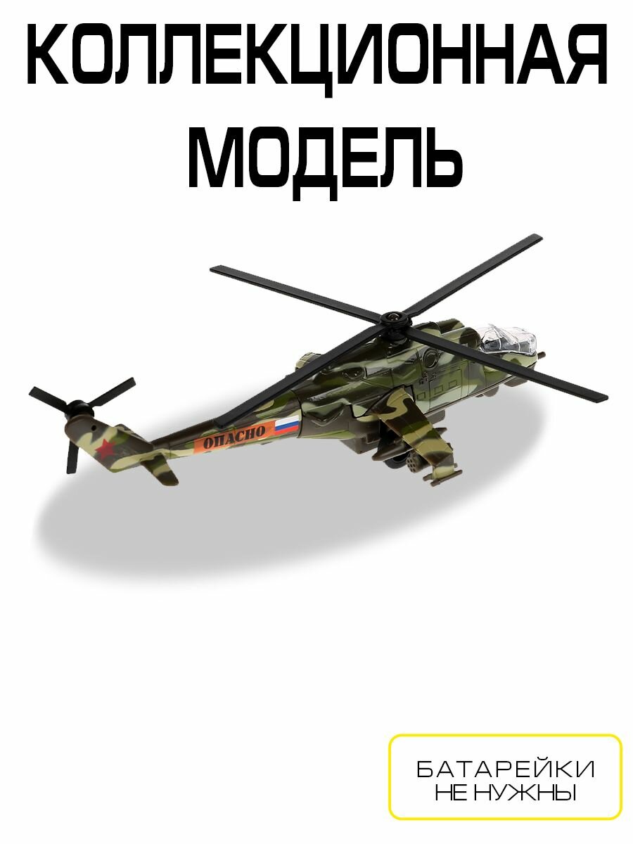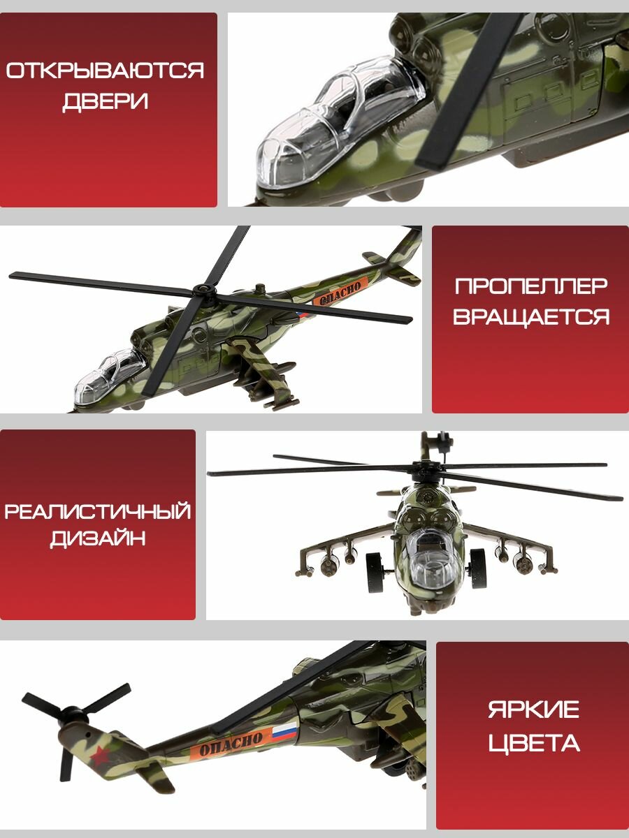 Коллекционный "Вертолет МИ-24" обладает инерционным механизмом, открывающейся кабиной и подвижными деталями. Игрушка сделана из металла, поэтому сломать ее очень непросто. Модель - копия настоящего вертолета. У вертолета крутится пропеллер. Развивает фантазию и мелкую мотрику рук.
