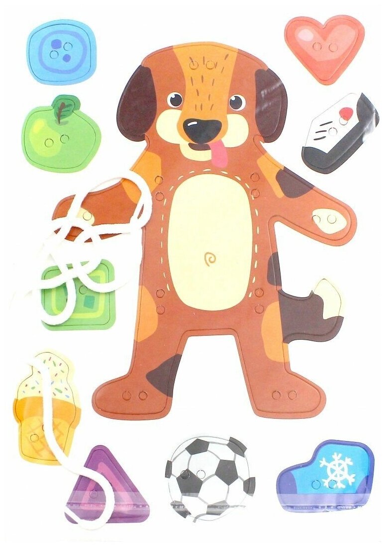 В яркий, красочный набор входит основа (ежик, медвежонок, пёс, барсук), разноцветные элементы к ней и шнурочки, с помощью которых они и крепятся.