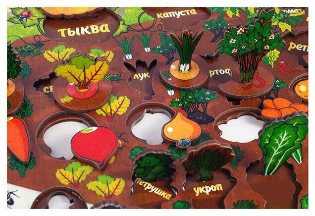 Игрушка из дерева Нескучные игры, Доска Овощи на грядке - это игровая панель для развития мелкой моторики, внимания, усидчивости и воображения Вашего малыша, на которой расположен маленький настольный огород, где растут овощи и живут насекомые.