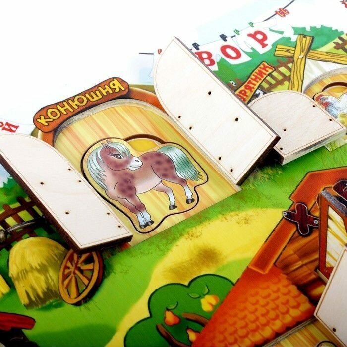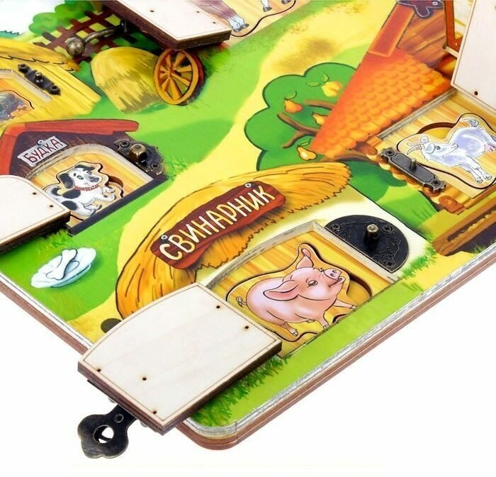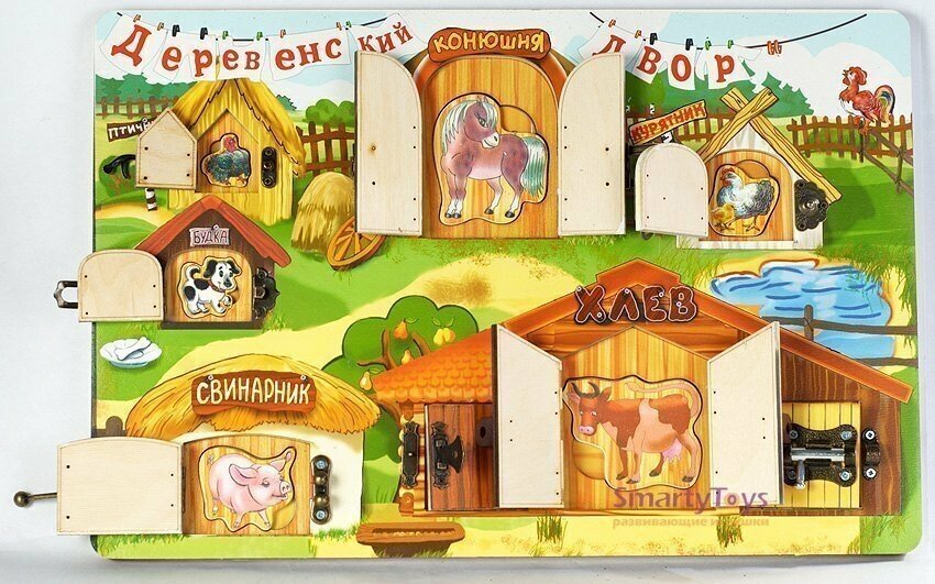 Игровая панель с 6-ю домиками. За дверцами с разными замочками спрятаны деревенские животные. Под каждой фигуркой спрятаны разные предметы, связанные с этим животным. Эта игровая панель специально разработана для развития мелкой моторики, внимания, усидчивости и воображения Вашего малыша.