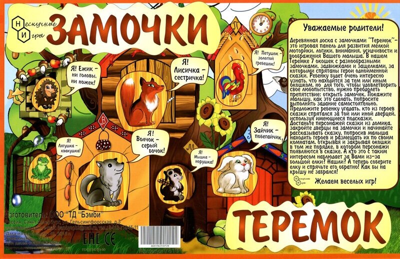 Игровая панель с пазлами и 7-ю окошками, за которыми спрятаны герои одноименной сказки. Все окошки закрыты на разные замочки и защелки, а самые наблюдательные найдут, кто же спрятался за елкой.