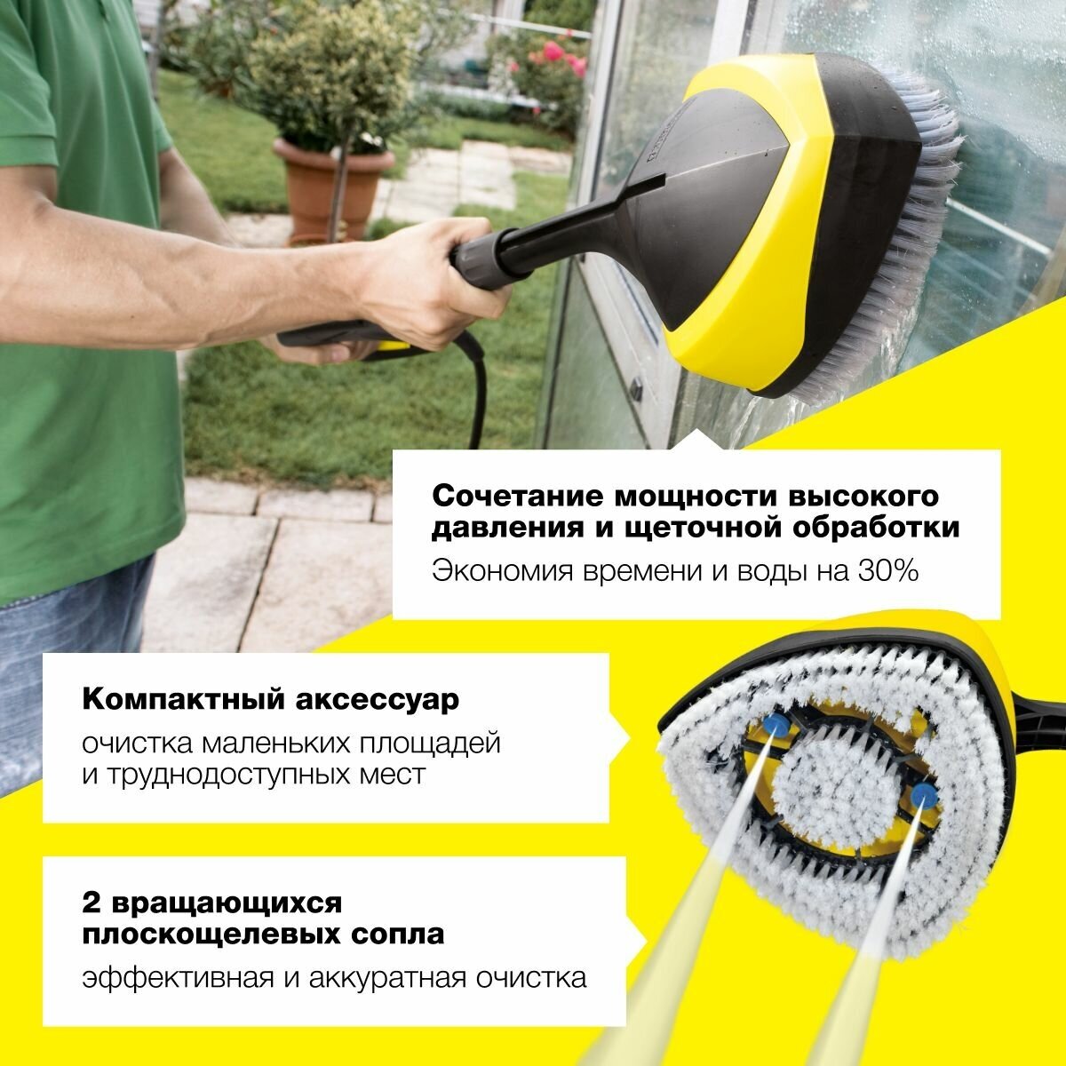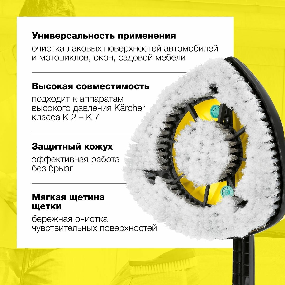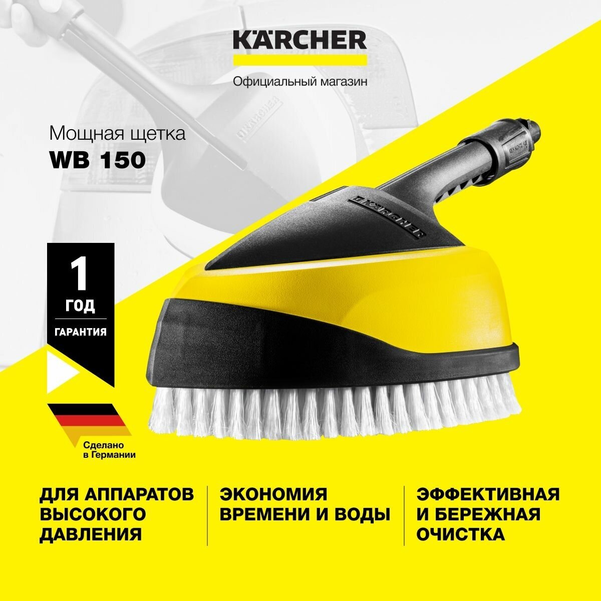 Щетка WB 150 идеально подходит для чистки чувствительных поверхностей, таких как лаковые поверхности автомобилей и мотоциклов, окна, стекла зимних садов, гаражные ворота, ролеты, жалюзи, садовая мебель, велосипеды и т. д. Инновационная моющая щетка с двумя вращающимися плоскощелевыми соплами совмещает мощную силу с щадящим действием. Работа с WB 150 дает значительную экономию энергии и воды и до 30% экономию времени. Быстрая, эффективная и легкая чистка высоким давлением в сочетании со щеткой обеспечивает еще больше чистоты в доме и в саду. Подходит к бытовым аппаратам высокого давления.