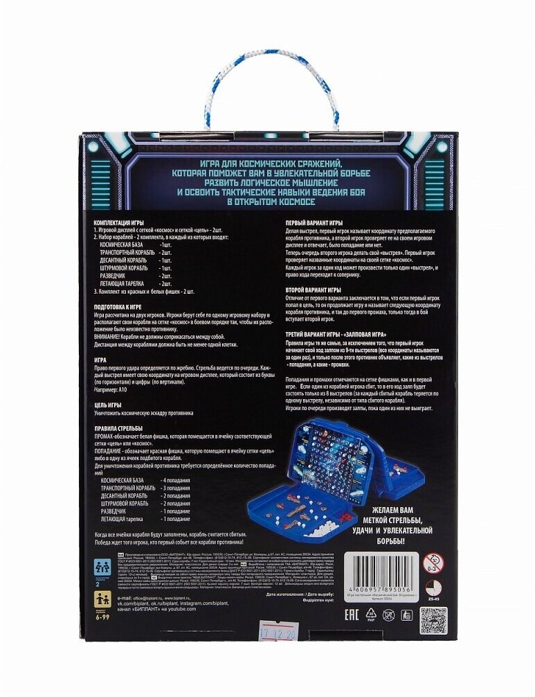 | Комплект игры | игровой дисплей с сеткой "космос" и сеткой "цель" - 2 штуки, 2 набора кораблей, в каждом наборе космическая база, транспортный корабль, десантный корабль, штурмовой корабль, разведчик, летающая тарелка, комплект игровых фишек |