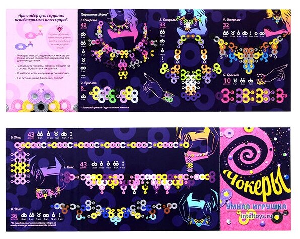 Набор для создания неповторимых аксессуаров. Легко собираются между собой и имеют множество вариантов соединения деталей. Собирайте чокеры, пояски, ободки на голову, браслеты и ожерелья. В наборе есть камушки-украшалочки!