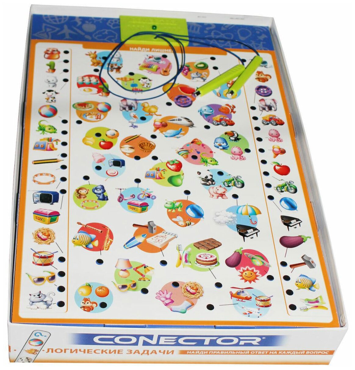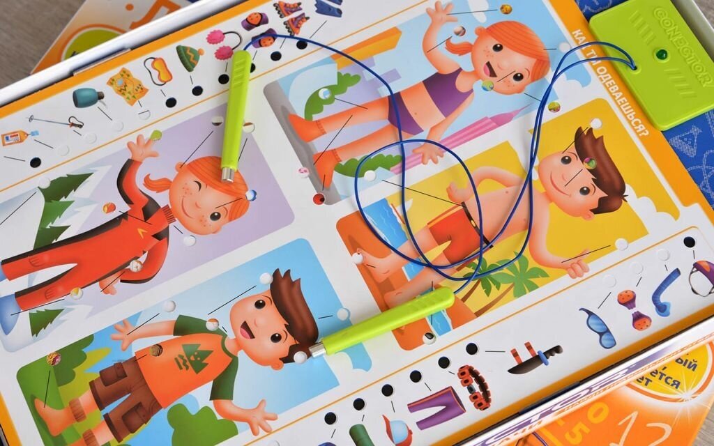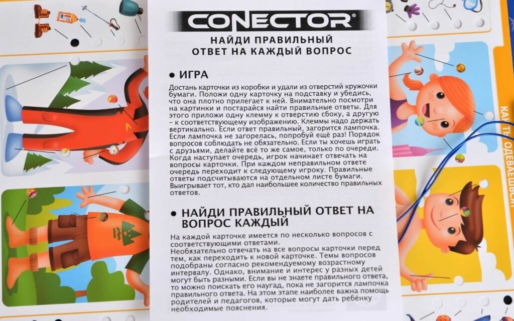 В набор входит электросхема, чтобы проверять ответы, а также 8 карт с вопросами на различные темы. К тому же на электронной схеме есть светодиод, который будет оповещать ребенка о правильном ответе.