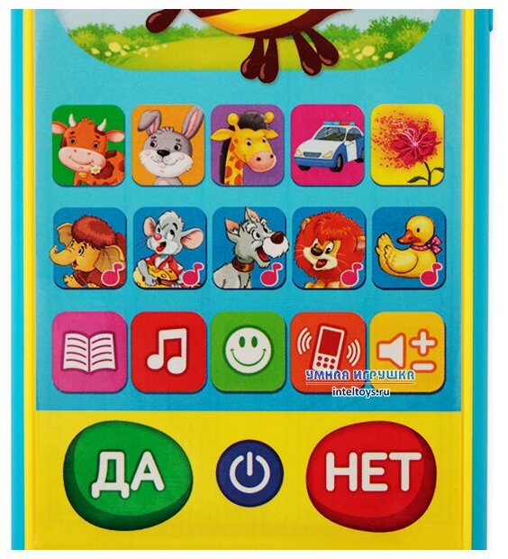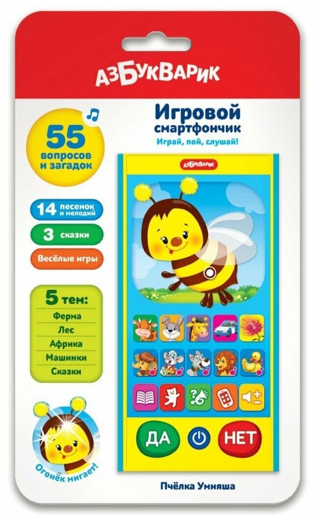 С этим чудо-смартфончиком можно и в весёлую викторину поиграть, и любимые песенки послушать! А поможет малышам Пчёлка Умняша! Она задаст 50 интересных вопросов по пяти темам: ферма, лес, Африка, машинки и сказки. Отвечай на вопросы – нажимай на кнопки ДА или НЕТ. А ещё тебя ждут 3 мультсказки: «Трям! Здравствуйте!», «Марусина карусель», «Чучело-Мяучело». Послушай истории о приключениях любимых героев! Хочешь сделать музыкальную паузу? В смартфончике собрано 14 песенок и мелодий: «Какой чудесный день!», «Настоящий друг», «Пропала собака», «Песенка Мамонтёнка», «Если весело живётся, делай так» и др. А потом – обязательно сыграй в игру «Угадай песенку»! Это так весело!