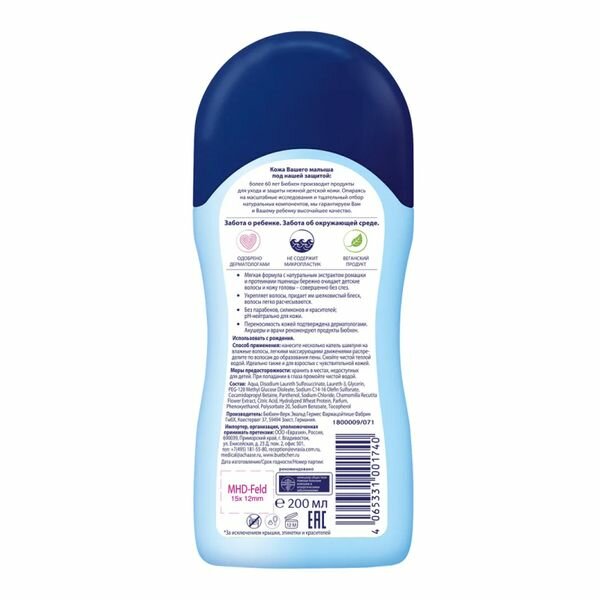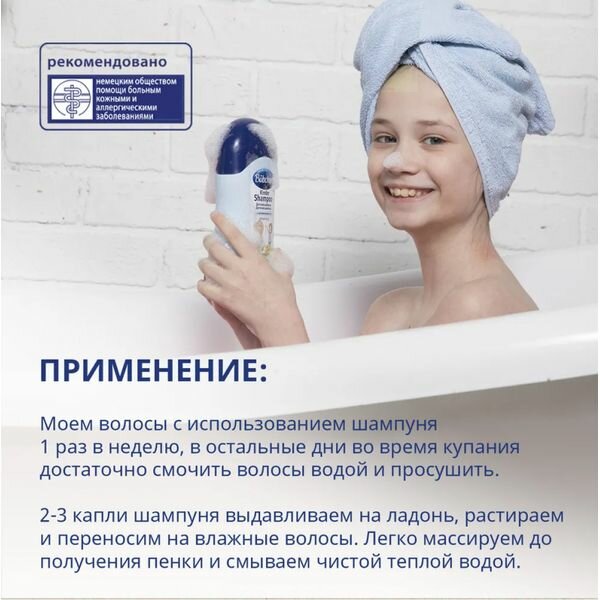 | Описание товара | Нежный детский шампунь моет особенно бережно и предотвращает сухость кожи головы. Волосы легко расчесываются и приобретают естественный шелковичтый блеск. Использовать с рождения. Идеально также и для взрослых. С моющими веществами на растительной основе, не раздражает глаза. |