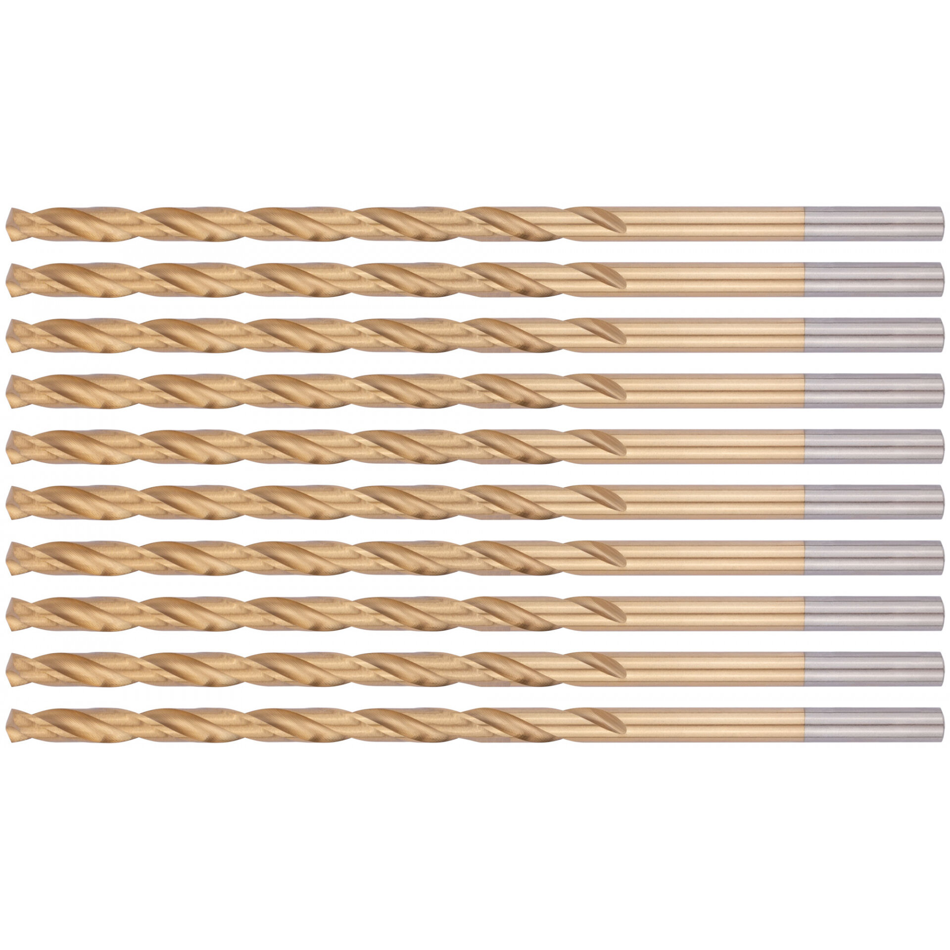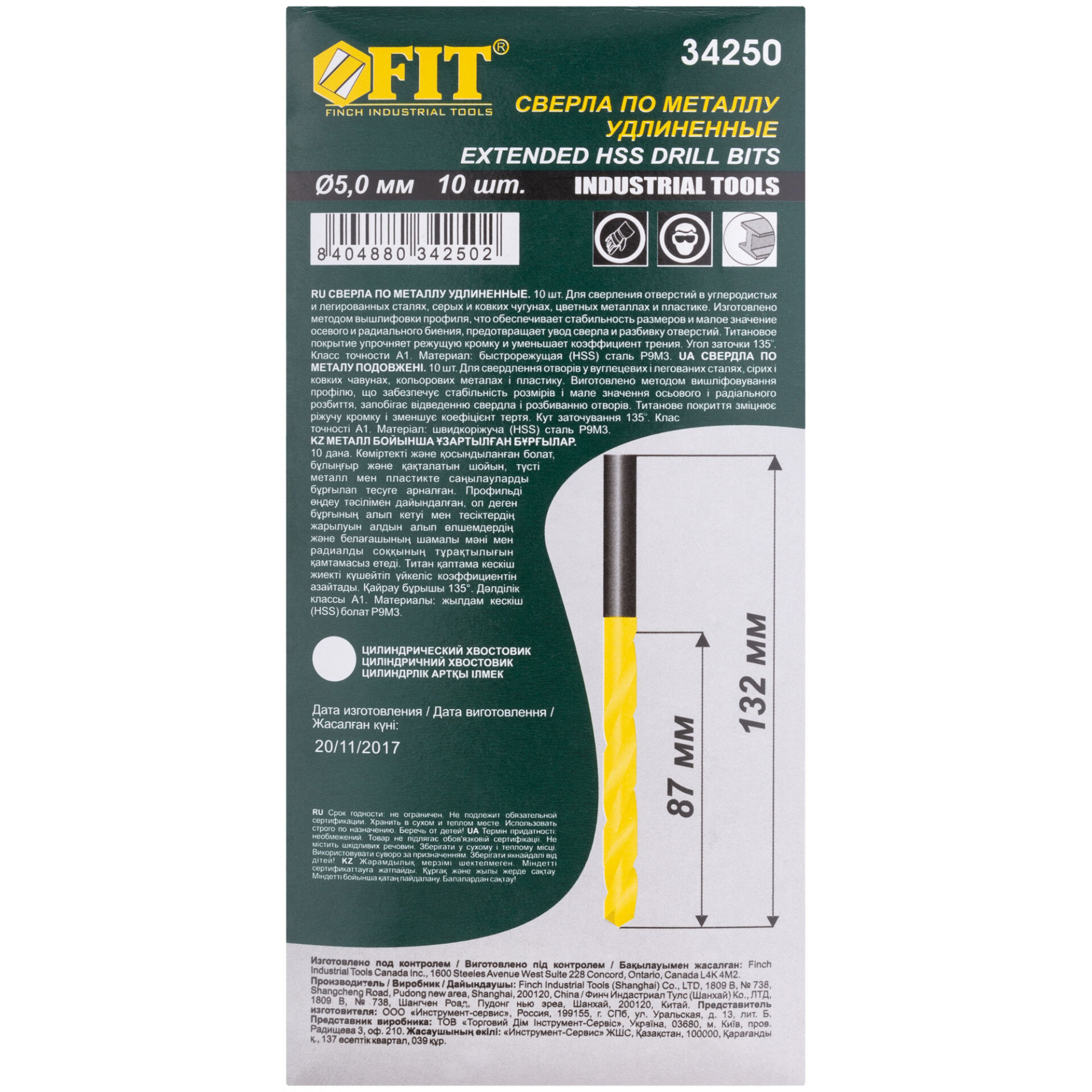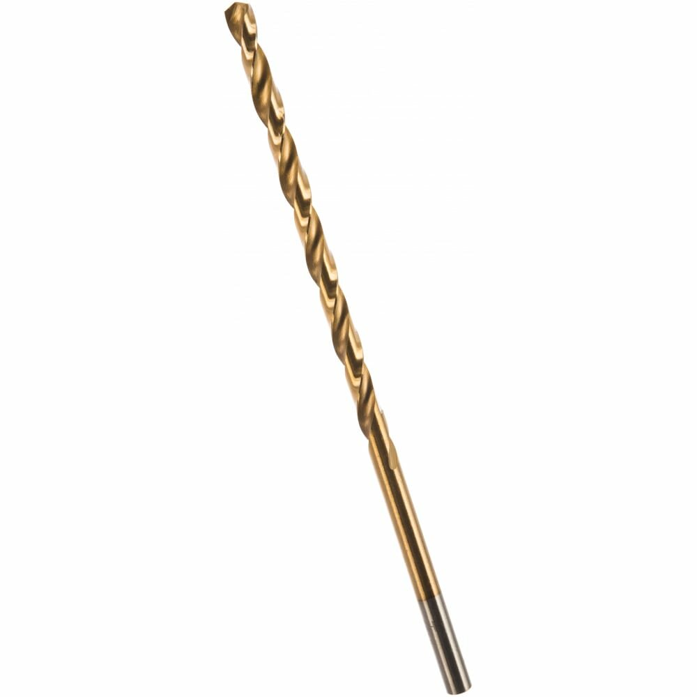 Сверло удлиненное, изготовлено из быстрорежущей стали (HSS) c титановым покрытием и имеет вышлифованный профиль. Предназначено для сверления отверстий в металле. Длина: 132 мм. Диаметр: 5,0 мм. DIN 340. В упаковке: 10 штук.