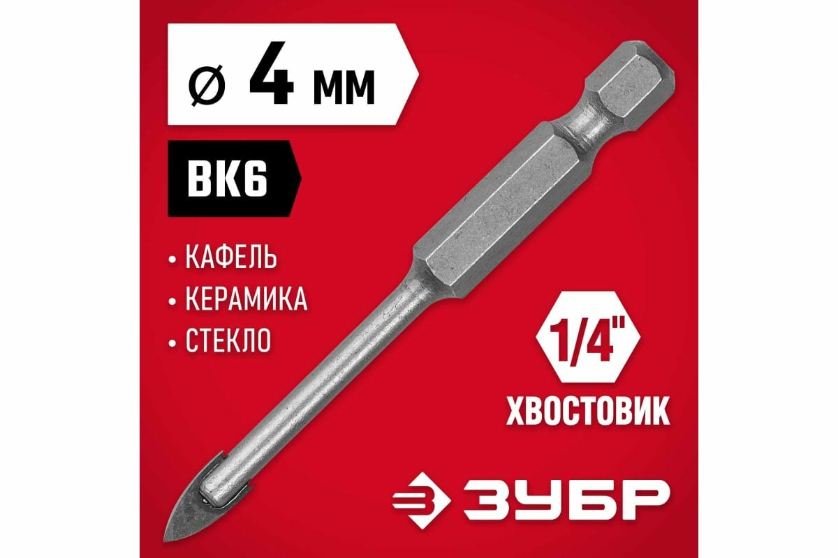 Сверло "мастер" Зубр используется для сверления отверстий в кафеле, керамике и стекле с помощью электродрели. Оснастка имеет шестигранный хвостовик для надежной фиксации в патроне, а также твердосплавные пластины ВК6 с отшлифованными режущими кромками для эффективной работы. Сверло имеет два режущих лезвия. Благодаря специальной проточке хвостовика 1/4 дюйма возможно использование с быстросъёмным адаптером. Рекомендуется охлаждение водой.