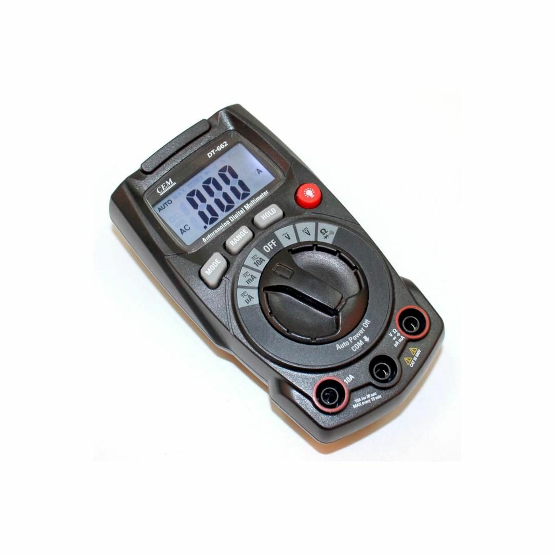| Описание | DT662-авто/ручной выбор диапазонов, отсчетов 2000, AC/DC напряжение и ток, сопротивление, тест диодов, прозвонка, HOLD.,DT-662цифровой мультиметр, производства компании CEM-instruments.,Предназначен для измерения переменного и постоянного напряжений до 600В и токов до 10А, сопротивления до 20 МОм,Особенностью цифрового мультиметра DT662 является промышленное исполнение обеспечивающее высокий класс безопасности CAT lIl 600В EN61010-1 на всех диапазонах.,Питание мультиметра DT662 выполняется от 2-x элементов питания 1,5В , типоразмера ААА что удобно, так как такие элементы недороги и повсеместно распостранены.,ОСОБЕННОСТИ цифровых мультиметров CEM DT662?:,• Питание от 2-х батарей 1,5В типа ААА,• Защита в соответствии с CAT lIl 600В EN61010-1 на всех диапазонах,• Яркая подсветка дисплея, функции HOLD / MIN / MAX,• Тест на проводимость со звуковой индикацией, тестирование диодов,• Индикация недостаточного заряда батареи.,ТЕХНИЧЕСКИЕ ХАРАКТЕРИСТИКИ мультиметра CEM DT662:,• Напряжение DC |