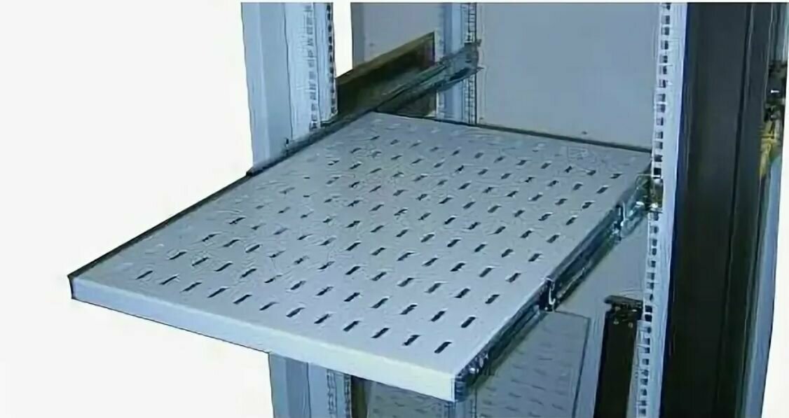 | Эксплуатационные характеристики | Полка имеет телескопические направляющие, обеспечивающие плавное выдвижение. , Монтажные кронштейны фиксируют полку к вертикальным направляющим шкафов и стоек в четырех местах., Глубина монтажных кронштейнов регулируется, что позволяет устанавливать полку на необходимую глубину. , Полка перфорирована для свободного прохождения охлаждающего воздуха. |