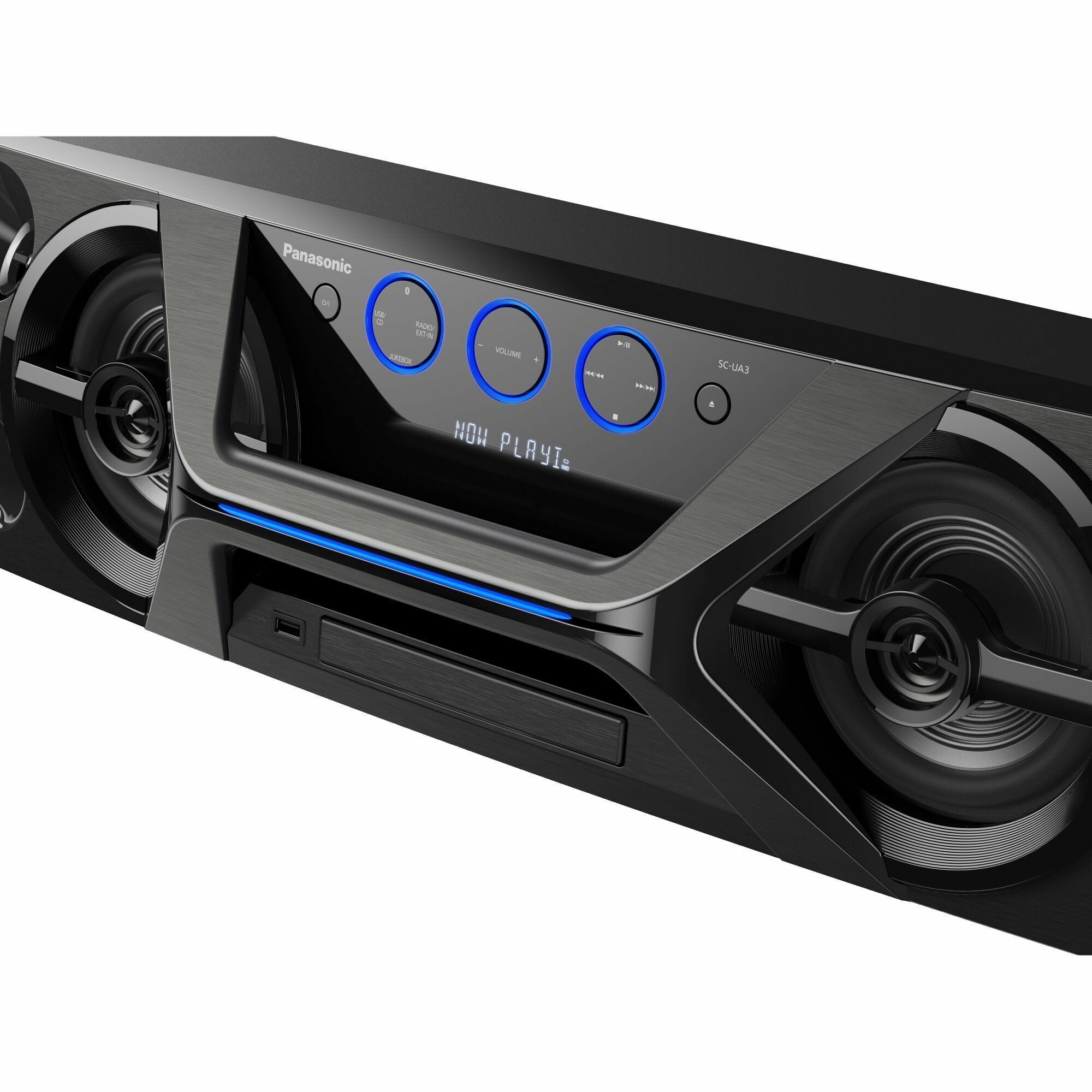 Возьмите высококачественную музыку из вашей гостиной с собой. Ваша новая стильная городская жизнь начинается здесь, с нашей универсальной аудиосистемой Panasonic SC-UA3, объединяющей все необходимое в одном корпусе. Центральные клавиши управления подсвечиваются, линия вдоль рукоятки также освещается. Эти синие огни, светящиеся на темной поверхности, придают конструкции городской стиль.