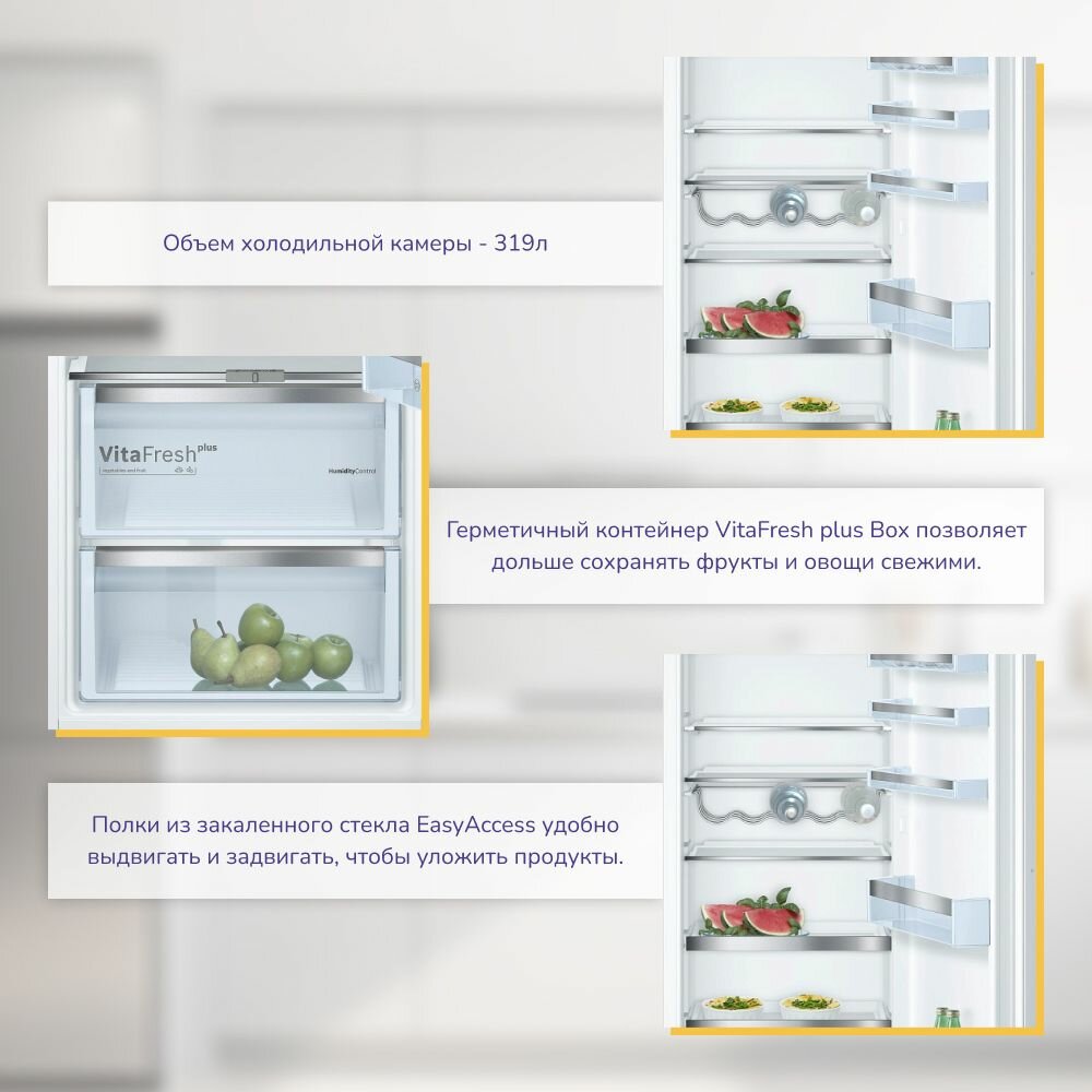 Герметичная зона свежести VitaFresh plus Box: крайне эффективное решение, позволяющее сохраненять фрукты и овощи свежими до двух раз дольше Электронная система управления температурой: установите нужную температуру с легкостью и точностью. Система полок VarioShelf представляет собой разделяющиеся стеклянные полки для удобного хранения бутылок и крупной посуды. Полки EasyAccess: выдвижные полки из закаленного стекла для удобной загрузки и разгрузки, предоставляют широкий обзор помещенных продуктов.