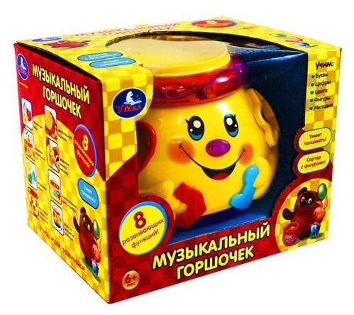Нам такой горшочек подарили. Сначала обрадовалась - яркий и красивый. Но, когда начали играть радость пропала. Очень громкий ну очень! Песня на русском из мультика про винни пуха. Очень яркая подсветка! Сильно бьет в глаза даже взрослым. И самое главное, там стоят цифры в неправильном расположения 1,3,2!!! Это как?)) буквы а,в,с на английском. Единственный плюс - сам едет. Жаль, но сейчас все игрушки чрезмерно громкие.