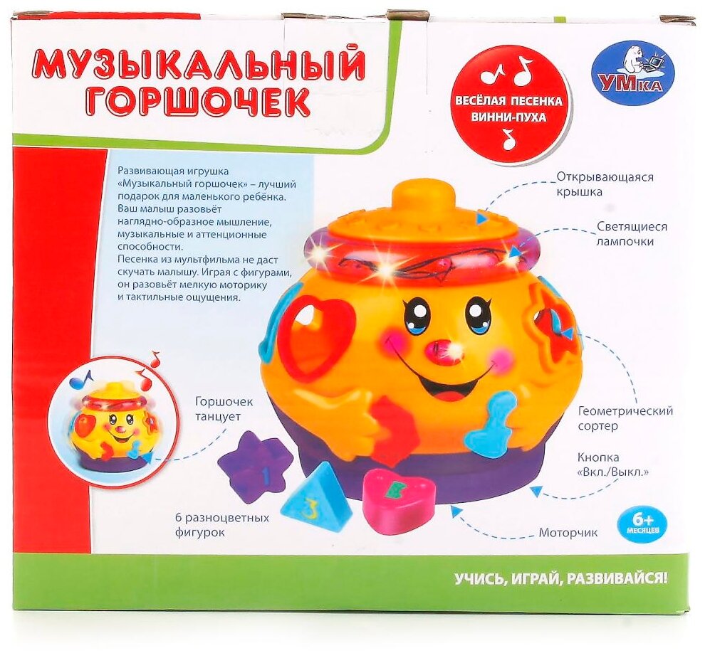 Игрушка выполнена из пластика ярких цветов и представляет собой горшочек с очаровательным улыбающимся личиком, носиком-лампочкой и снимающейся крышечкой. По бокам игрушки находятся шесть фигурных отверстий для фигурок в виде сердечка, звездочки и треугольника (по три фигурки с цифрами и буквами). Задача малыша заключается в том, чтобы опустить фигурки в соответствующие им отверстия. Сняв крышечку, ребенок сможет достать фигурки и начать игру сначала.