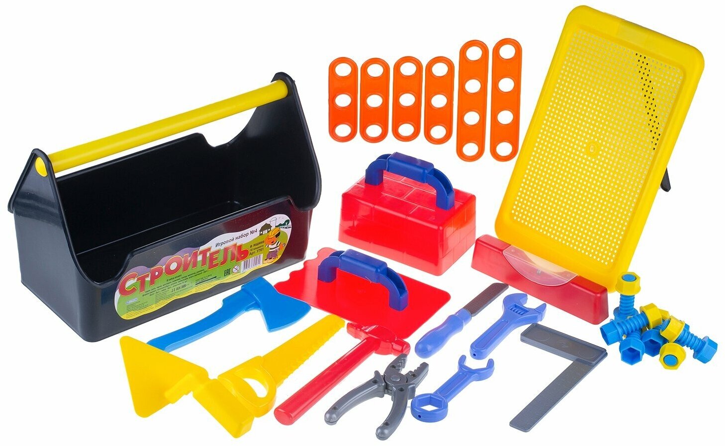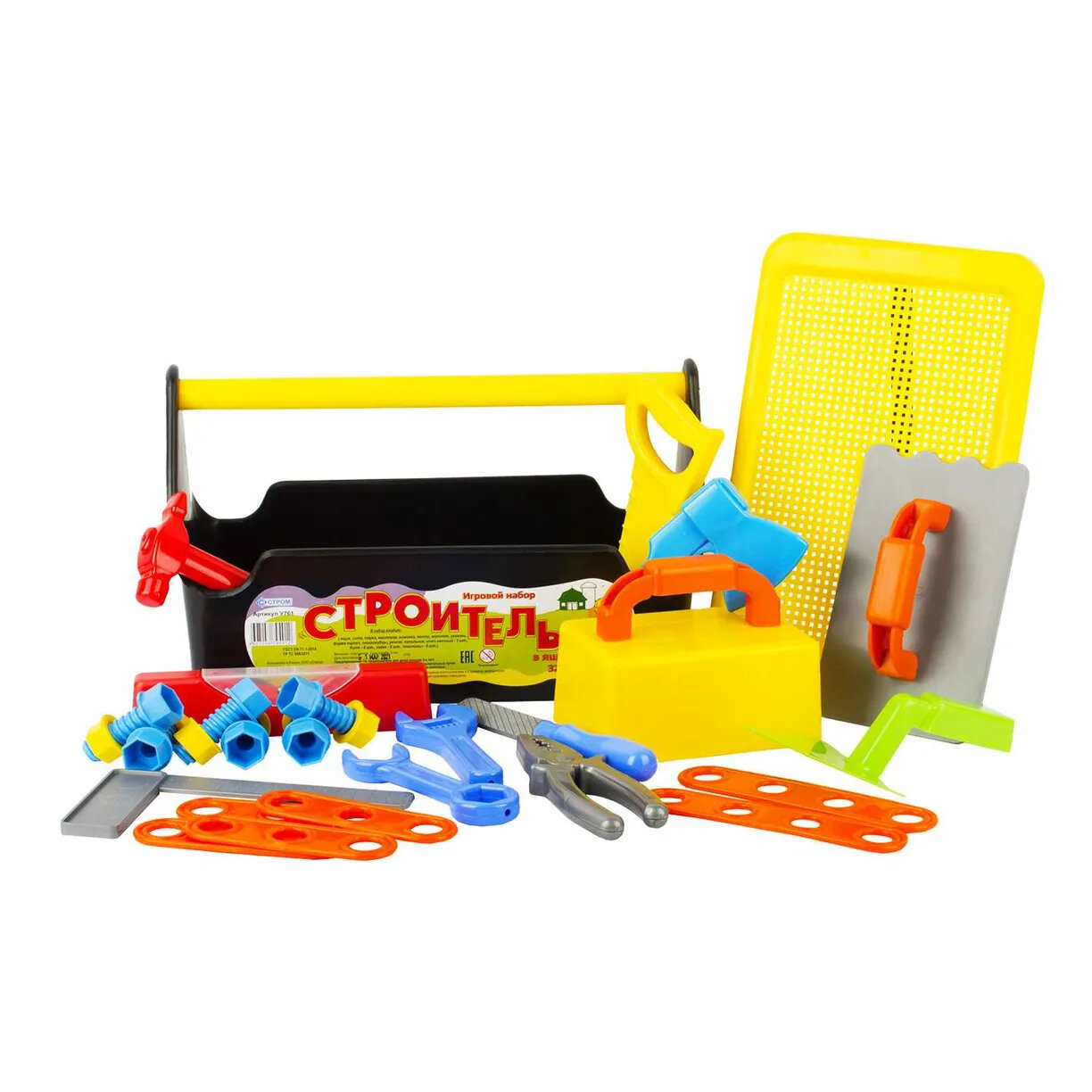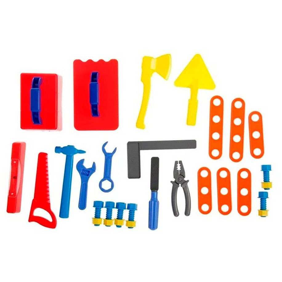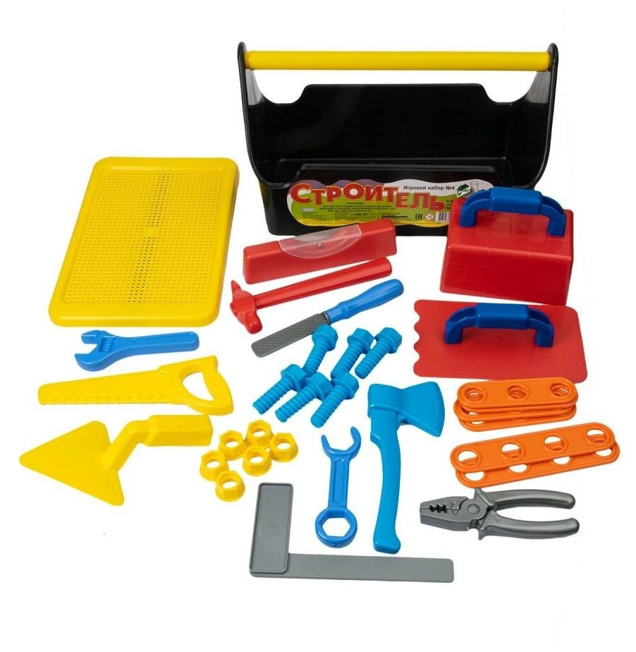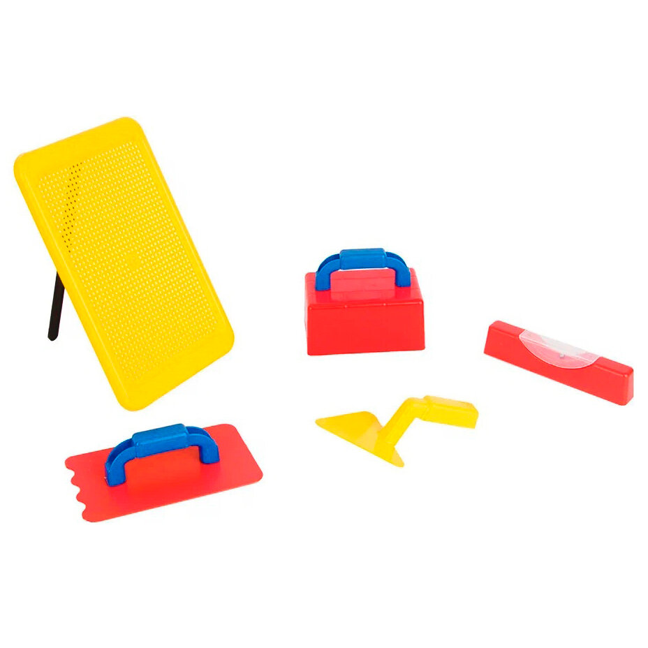 С таким интересным и увлекательным игровым набором "Строитель" маленький ребенок сможет почувствовать себя настоящим мастером , который с легкостью справится с любой задачей и сможет починить поломанную вещь. В набор входят различные гайки и болты, при помощи которых ребенок сможет скреплять специальные пластины, получая при этом новые навыки. Комлект: сито терка мастерок ножовка топор молоток уровень форма кирпич плоскогубцы напильник ключ гаечный 2шт болт 6шт гайка 6шт пластины 6шт.