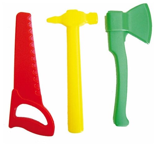Столярный набор хорош тем, что инструменты выполнены очень детально, «почти как настоящие», хоть и сделаны из разноцветной пластмассы. В набор входят топор длиной 18 см, молоток длиной 18 см и ножовка длиной 20 см.