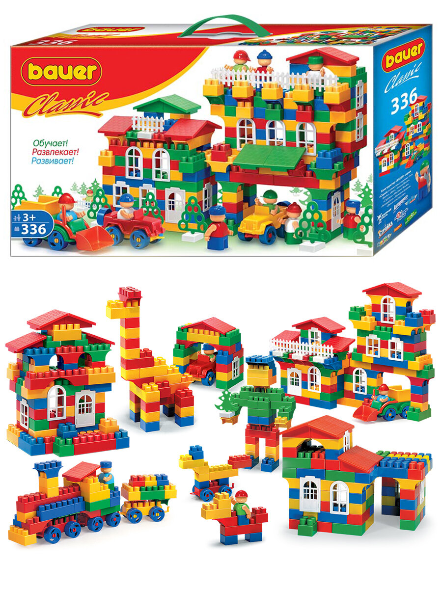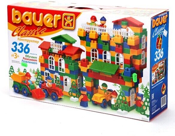 Новая современная версия классический блочного конструктора, изготовленного из безопасного пластика и пищевых красителей. Предназначен для детей от 3х лет. Развивает мелкую моторику, пространственное мышление и фантазию. В комплекте: кубики различного размера, фигурки человечков, инструменты, сборные машинки, элементы декора (заборы, деревья, окна, двери, крыши). Конструктор Bauer Classic New захватывающая обучающая игра для детей, позволяющая строить объекты различной сложности. Во время игры ребенок учится различать цвета, геометрические фигуры и изучает пространственное моделирование. Конструктор Bauer Классик способствует развитию воображения, улучшает мелкую моторику рук, стимулирует творческую активность ребенка. Всего 336 элементов.