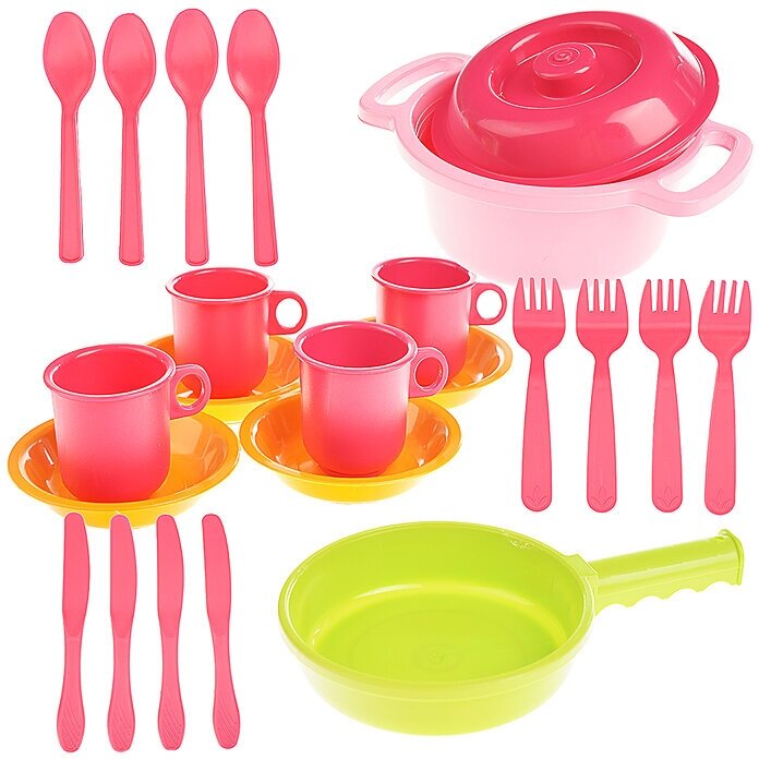 Игровой набор "Настенька" от компании "Росигрушка" украсит любую детскую кухню. В него входят 23 предмета, которые сделают игру по приготовлению пищи более занимательной. Разноцветная посудка также пригодится при организации чайной вечеринки или пикника для любимых кукол, а также помогут разнообразить времяпрепровождение в песочнице.