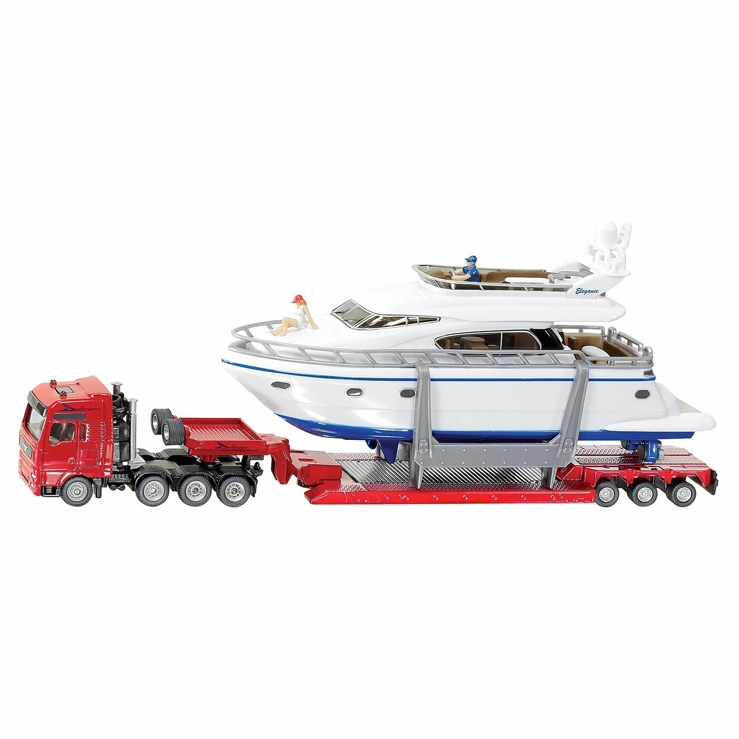 Масштабный тягач с яхтой от Siku представляет собой уменьшенную копию его настоящего аналога в 87 раз. Это очень мощная машина, которая может перевозить тяжелейший груз. В данном случае тягач переправляет яхту. Такие машины необходимы для подобных целей, их технические данные и дизайн разработаны специально для этих манипуляций.Корпус данной игрушечной машины изготовлен из металла, а стекла - из прозрачного пластика. Резиновые колеса свободно вращаются, прицеп можно отсоединить. У яхты также можно снять палубу. Такая игрушка, благодаря своей реалистичности, очень привлекательна для игры. Ребенок может проявить и развить свою фантазию и расширить кругозор.