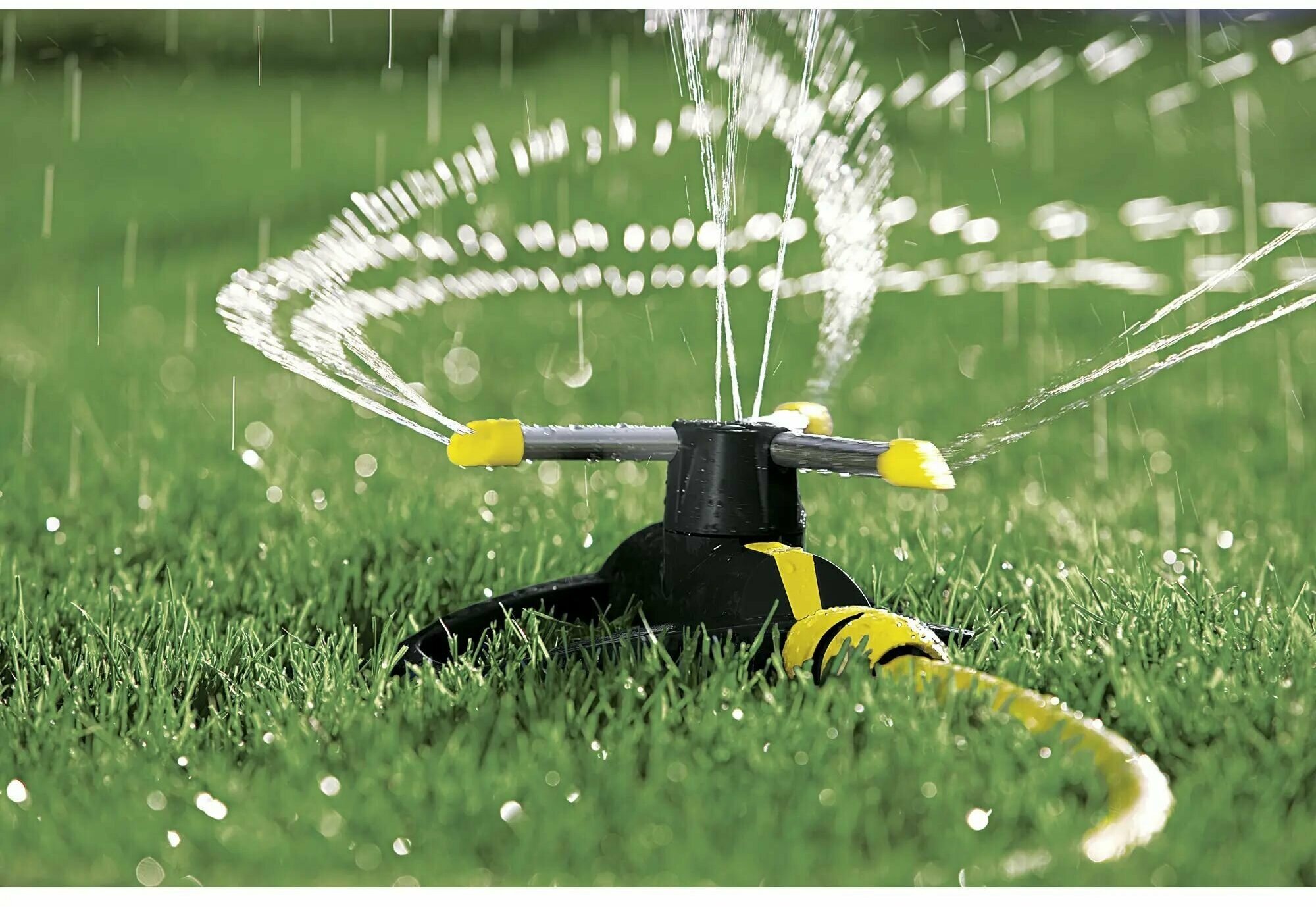 **Дождеватель круговой Karcher RS 130/3** предназначен для орошения частных, административных, общественных территорий с любыми насаждениями. Вода в дождеватель подается через шланг, крепится при помощи соединителя. Конструкция оснащена тремя соплами, вращающимися на металлических кронштейнах. При помощи их поворота можно регулировать интенсивность и диаметр полива.